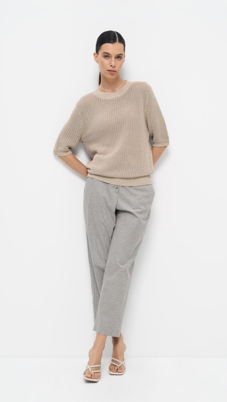 Пуловер О-образного силуэта выполнен в технике ажурной вязки шнуром. Используемая пряжа придаёт изделию особый глянцевый деликатный блеск, который привлекает внимание и придаёт элегантность, а ажурная вязка, выполненная шнуром, создаёт кольчужный эффект, делая пуловер уникальным и стильным.