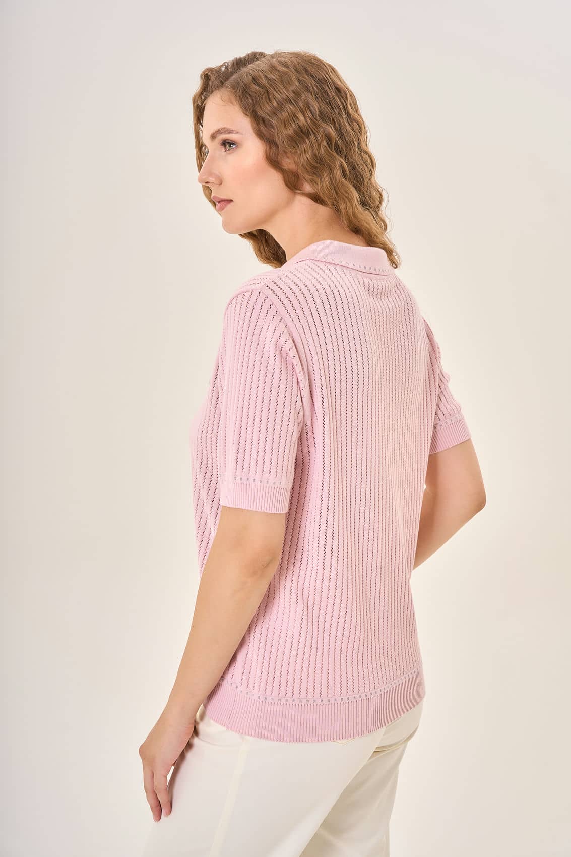 Розовая вязаная рубашка-поло с короткими рукавами. Классический воротник и три декоративные пуговицы придают ей нотку элегантности. Два небольших накладных кармана на груди украшены декоративными деталями, похожими на пуговицы или броши, добавляя шарм и оригинальность. Вертикальный ажурный узор делает рубашку воздушной и привлекательной.Отлично подойдет для создания нежного и современного образа.