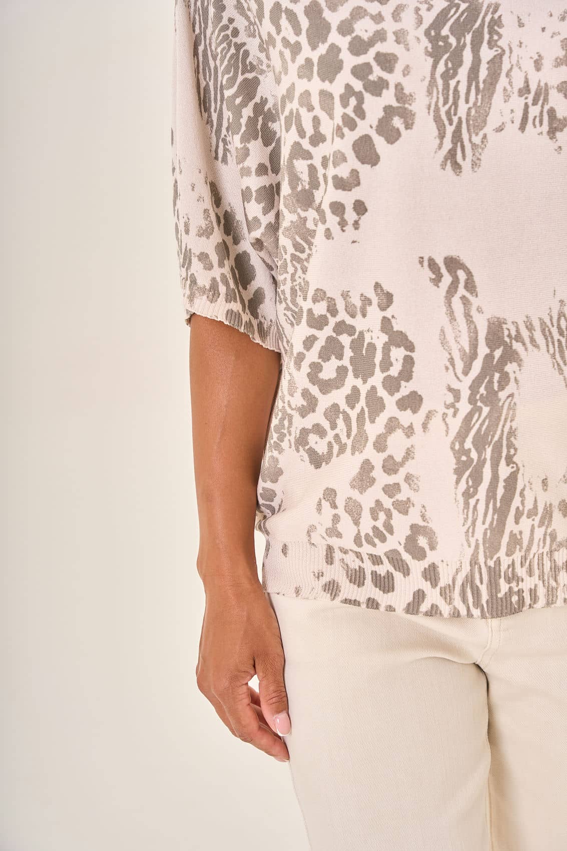 Светлая блузка с леопардовым принтом в серых оттенках. Элегантный фасон и свободный крой добавляют образу утонченности. Леопардовое графичное оформление в спокойных серых тонах придает индивидуальность и изысканность. Ткань высокого качества обеспечивает максимальный комфорт и удобство в течение всего дня. Прекрасно дополняет гардероб, создавая стильный и современный образ.