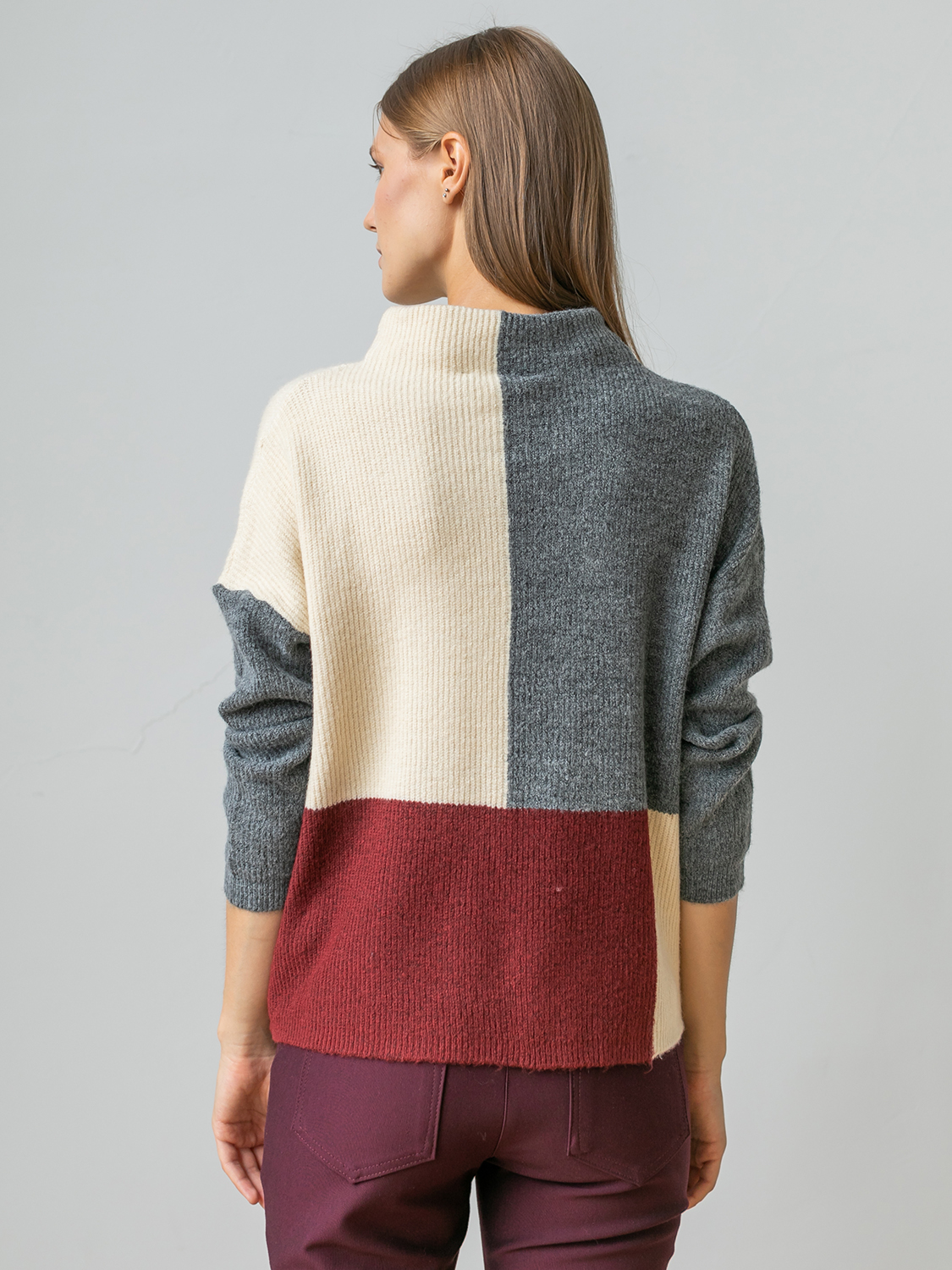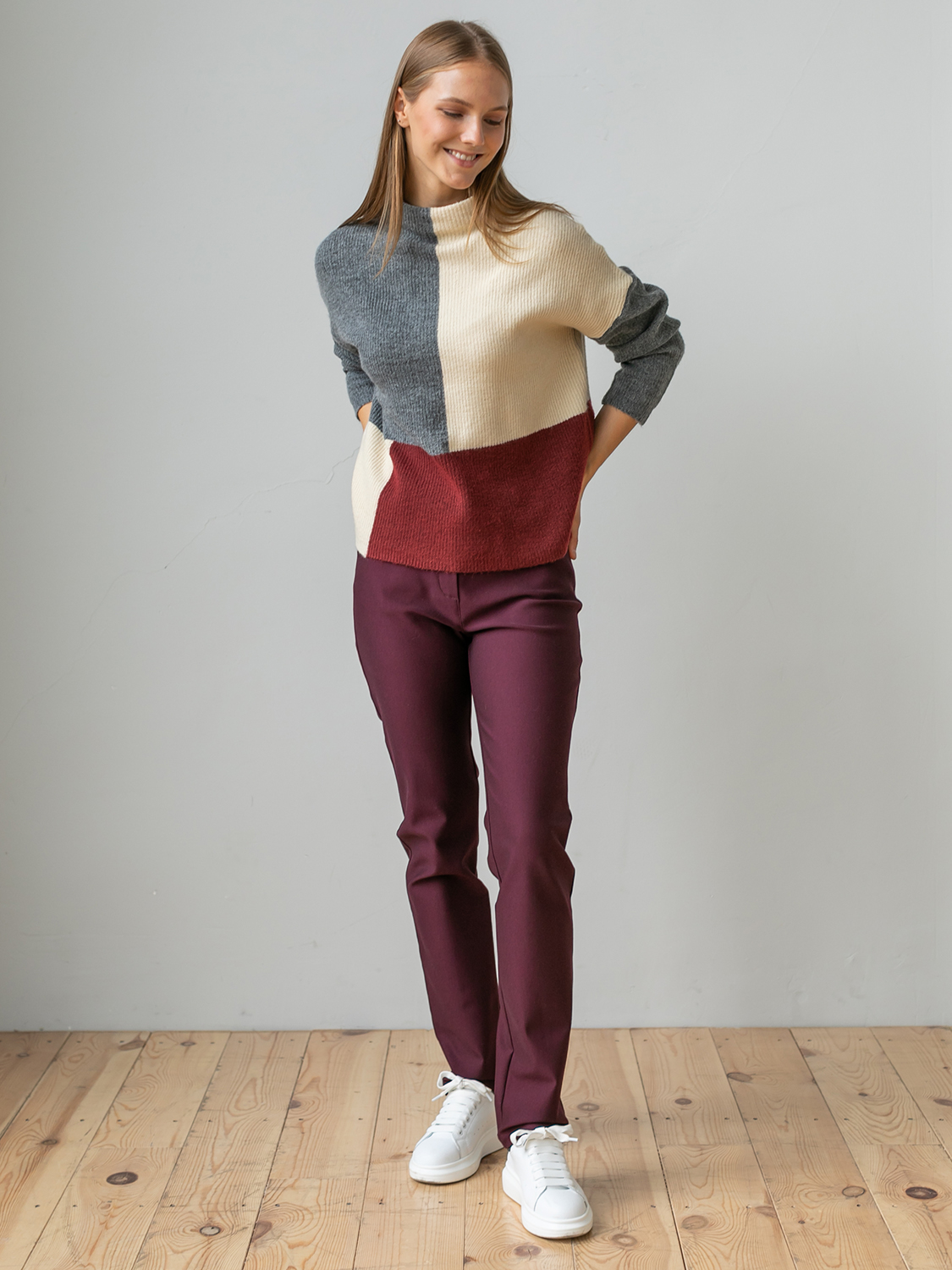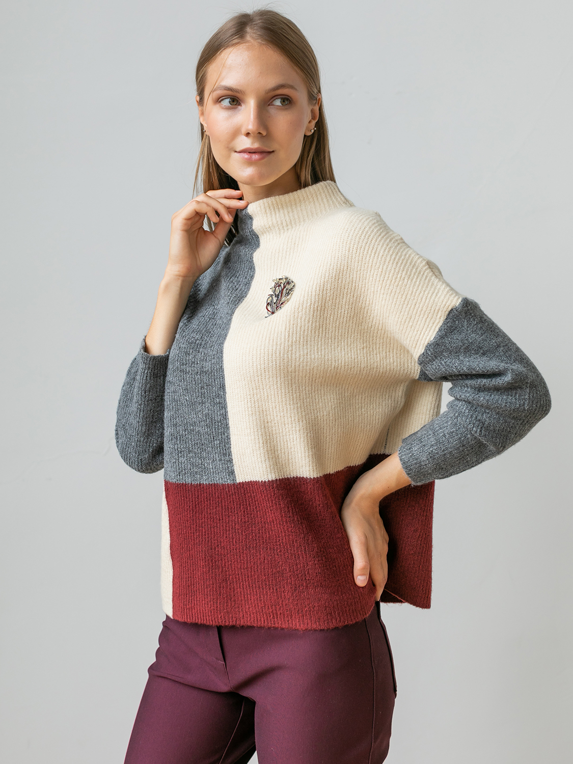 Оригинальный теплый джемпер в стиле колор-блок. Сочетание контрастных оттенков и геометрических форм создает яркий образ. Джемпер представлен в двух оттенках: красном и синем. Шерсть в составе делает материал приятным к телу. Прямой крой подходит любому типу фигуры.