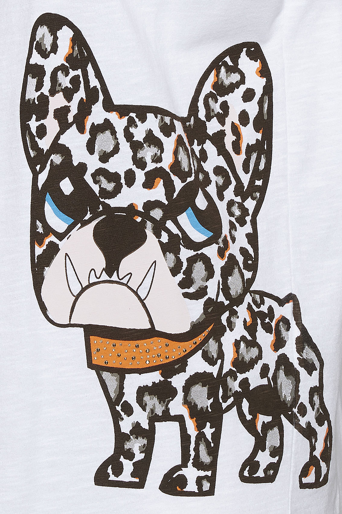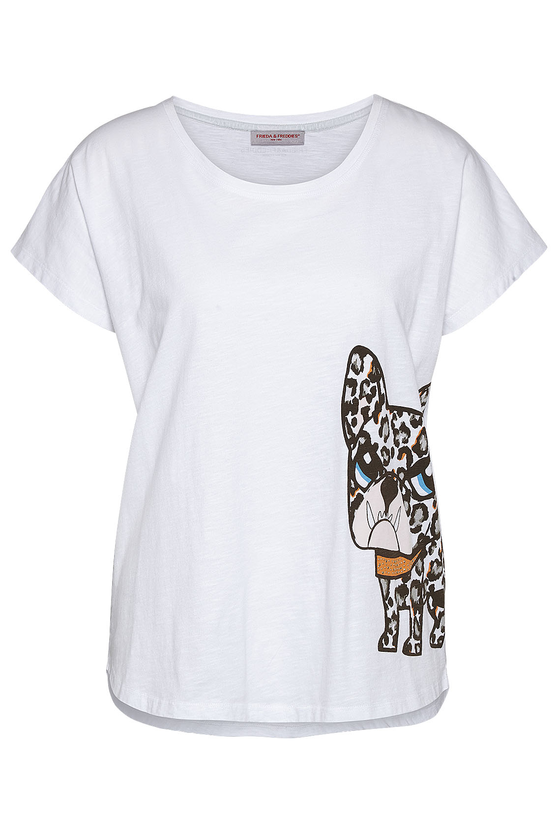Очаровательная футболка в стиле кэжуал. Прямой покрой и рукава со спущенным плечом, а также приятный хлопковый материал обеспечат удобство и комфорт. Завершают дизайн закругленная линия низа изделия и забавный принт.
