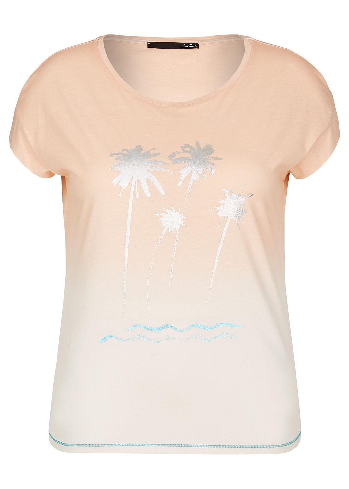 Футболка слегка приталенного силуэта. Модный эффект градиента, металлизированный принт с тропическими мотивами. Короткие цельнокроеные рукава. Декоративная отстрочка по нижнему краю. Приятный к телу хлопковый материал.