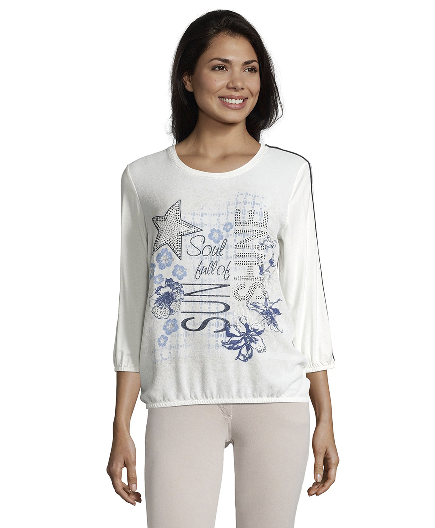 Свобода в тренде! Футболка свободного покроя. Круглый вырез горловины. Рукава 3/4 украшены тесьмой. Декор стразами придает образу нотку гламура. Материал из вискозной смеси приятен к телу и обеспечивает комфорт. Эта футболка станет изюминкой множества образов в стиле кэжуал.