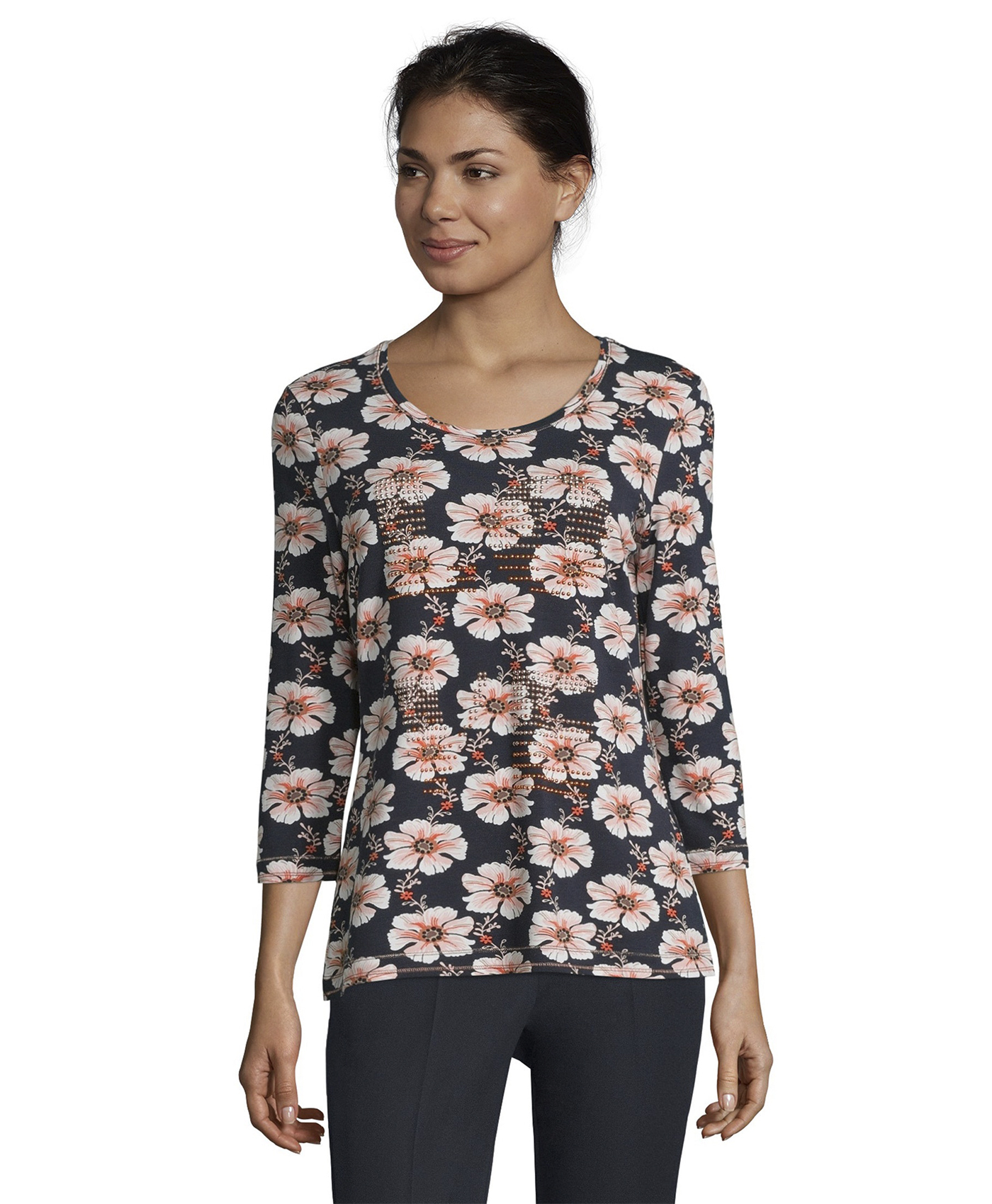 Цветочный принт в тренде! Футболка полуприлегающего силуэта с круглым вырезом горловины и рукавами 3/4. Стразы на груди придают блеск и гламур. Приятный к телу материал из смеси хлопка, модала и эластана обеспечивает комфорт. Эта футболка - отличный вариант верха для создания стильного повседневного образа.