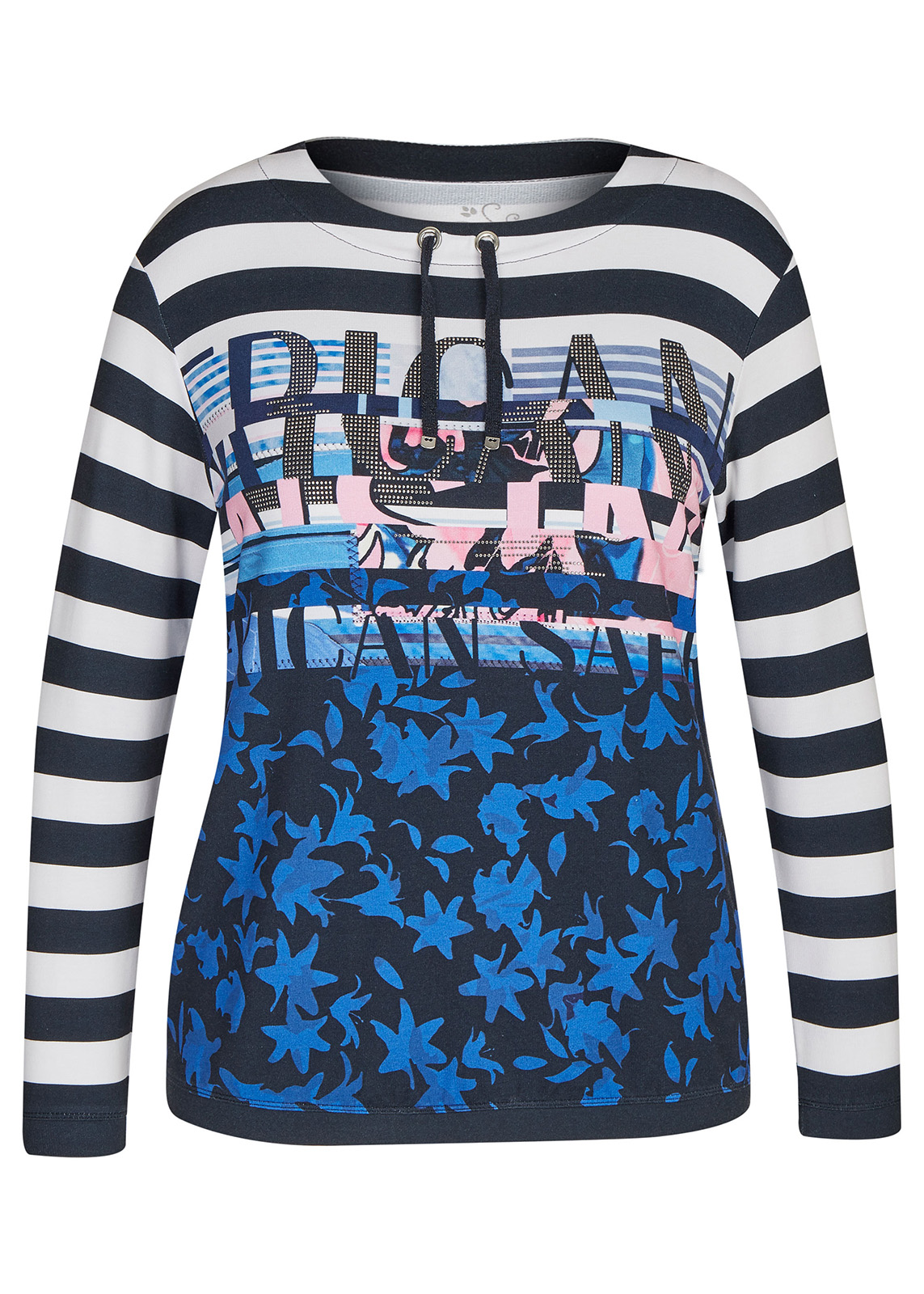 Футболка сочетает в себе урбанистический дизайн, цветочный принт и полоску - стильная эклектика в вашем повседневном образе. Круглый вырез горловины, кулиска с однотонным шнурком. Втачной рукав полной длины. Материал из смесовой вискозы обеспечивает комфортное ношение.