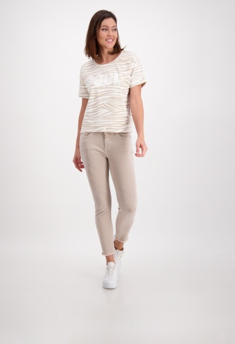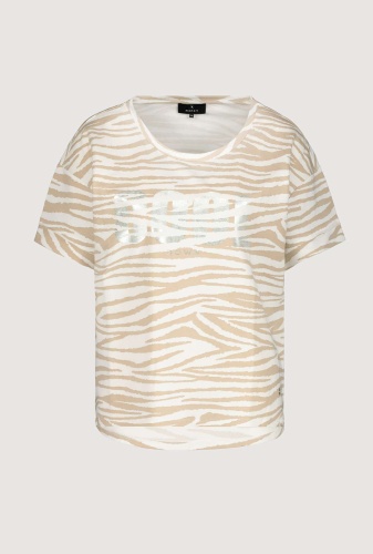 На сайте указаны российские размеры. Легкая футболка с короткими рукавами в анималистическом стиле. Модель с половиной рукавов имеет прямой фасон, круглый вырез горловины, края рукавов с притачными манжетами и необработанными краями, а также удлиненную спинку с закругленным краем. Великолепный рисунок зебры по всей поверхности оживляет дизайн. Параметры модели: 42 размер, рост 181 см