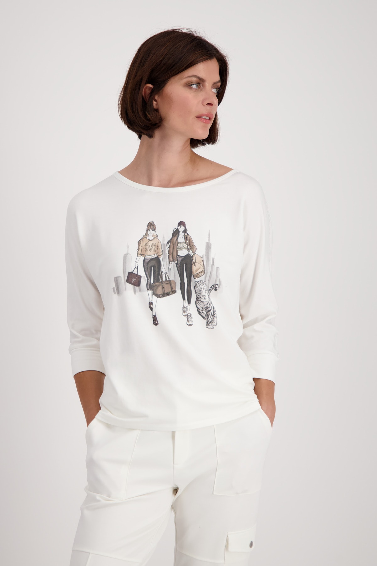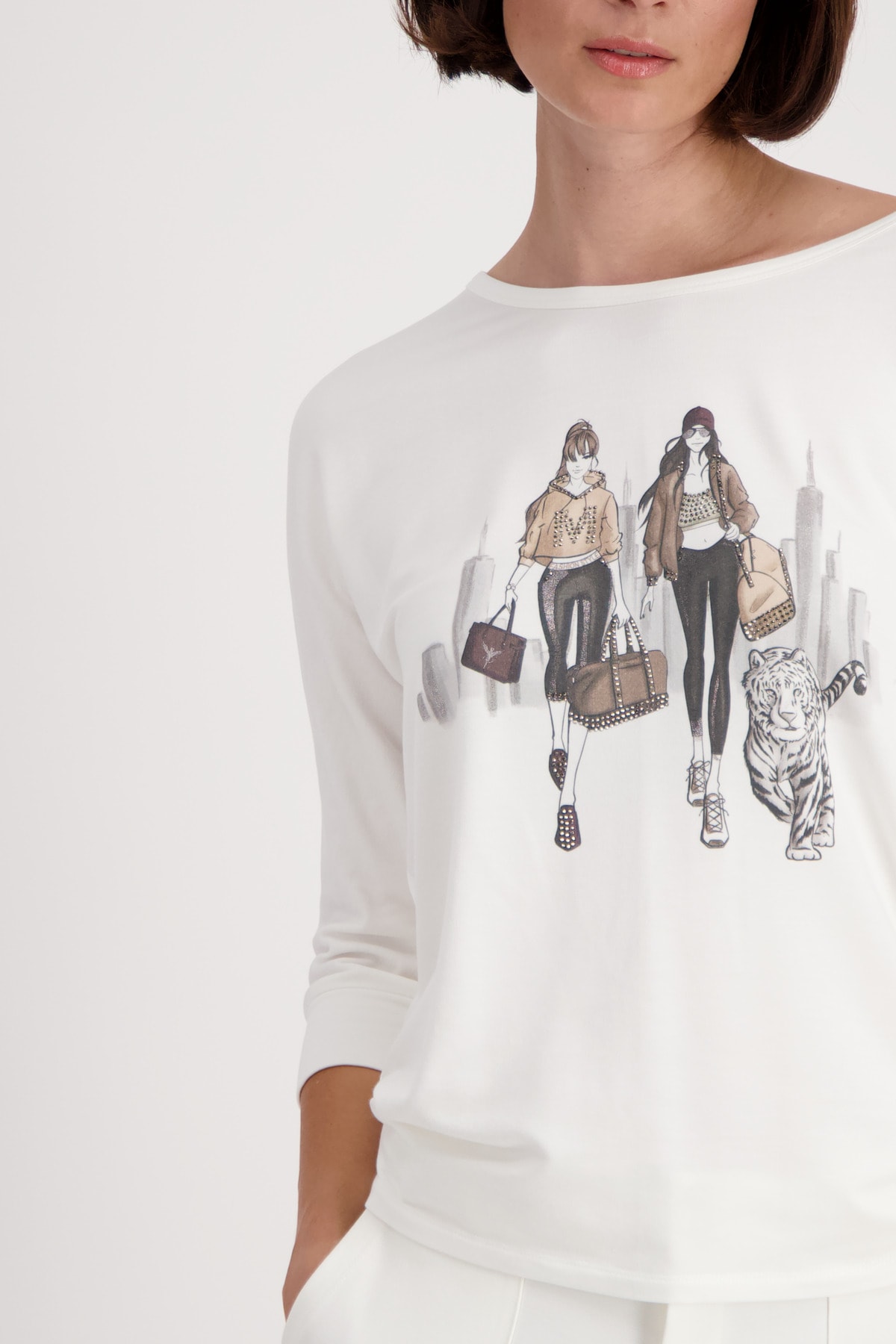 На сайте указаны российские размеры. Футболка из джерси с принтом и рукавами ¾ кремового цвета. Передняя часть этой рубашки из джерси монари украшена модным принтом с изображением двух женщин на фоне города и тигра. Работа украшена сверкающими деталями из страз. Фасон: прямого кроя со вставкой на круглом вырезе горловины, широкими манжетами на концах рукавов ¾ и объемными плечами. Изделие выглядит гламурно благодаря оверлочным швам с люрексом вдоль рукавов. Идеально подходит для хорошего самочувствия благодаря обработке струящейся вискозы, смешанной с модалом и стрейч. Модель ростом 176 см. Длина спины 44 размера составляет 62 см.