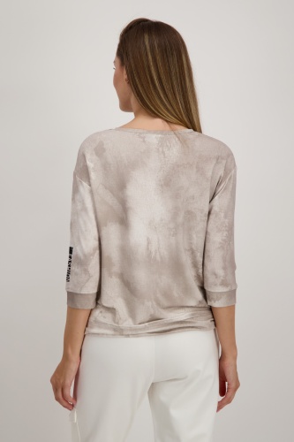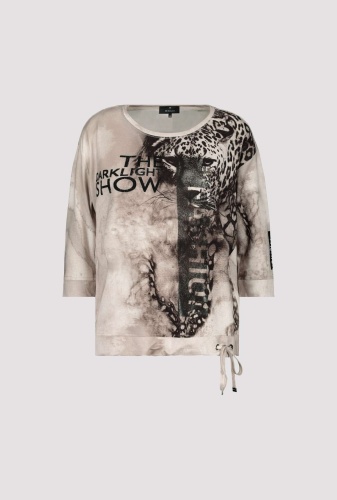 На сайте указаны российские размеры. Трикотажная рубашка от monari: прямой крой, рукава ¾, подол с кулиской и завязками, блестящий круглый вырез горловины с оверлоком с люрексом. Струящаяся вискоза в смеси с модалом и высокая доля стрейча гарантируют, что вы сразу же почувствуете себя комфортно. Большая леопардовая голова с лакированным принтом и блестящими надписями из страз украшает переднюю часть, делая ее гламурной и современной. Модель ростом 178 см Длина спины 44 размера составляет 62 см.