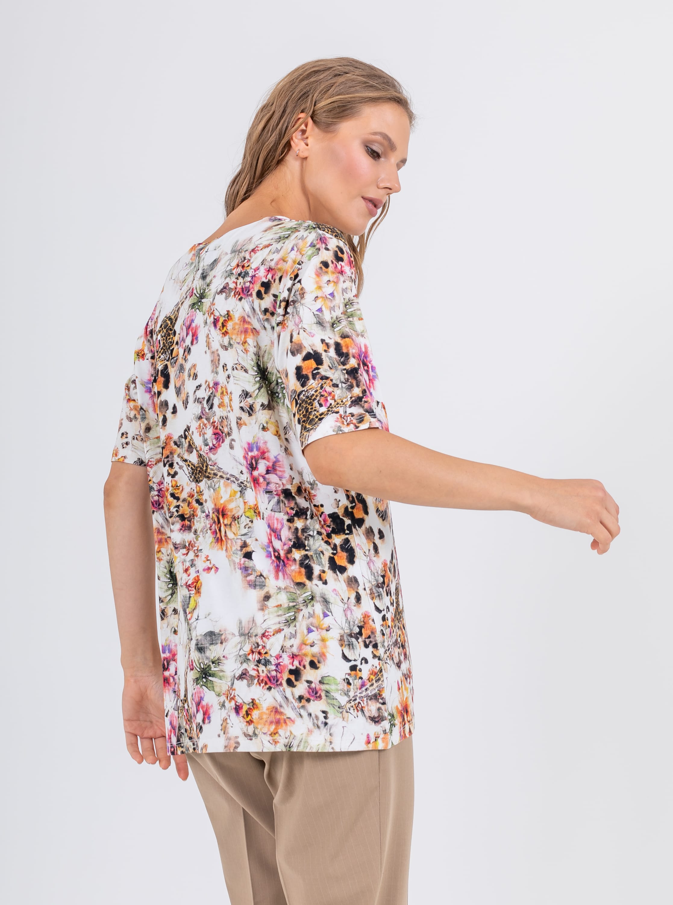 На сайте указаны российские размеры. Ткань: выполнена из гладкого хлопка высокого качества (92%) и эластана, добавляющего ткани упругости (8%) Крой: удлиненная футболка свободного силуэта. Имеет круглый вырез и свободные рукава-регланы, в которых удобно заниматься активной деятельностью и не испытывать дискомфорт при движении. Закрывает зону паха, визуально корректирует возможные недостатки в области бедер и живота. Отделка: яркий принт, в котором можно увидеть и тропические цветы и экзотического жирафа – лучшее украшение этой футболки. Россыпь изысканных страз добавляет ноту торжественности даже в обычный рабочий день. Запоминающийся принт футболки предполагает более сдержанный низ – однотонные брюки, юбки, шорты. Найти их можно в соответствующих разделах на сайте.