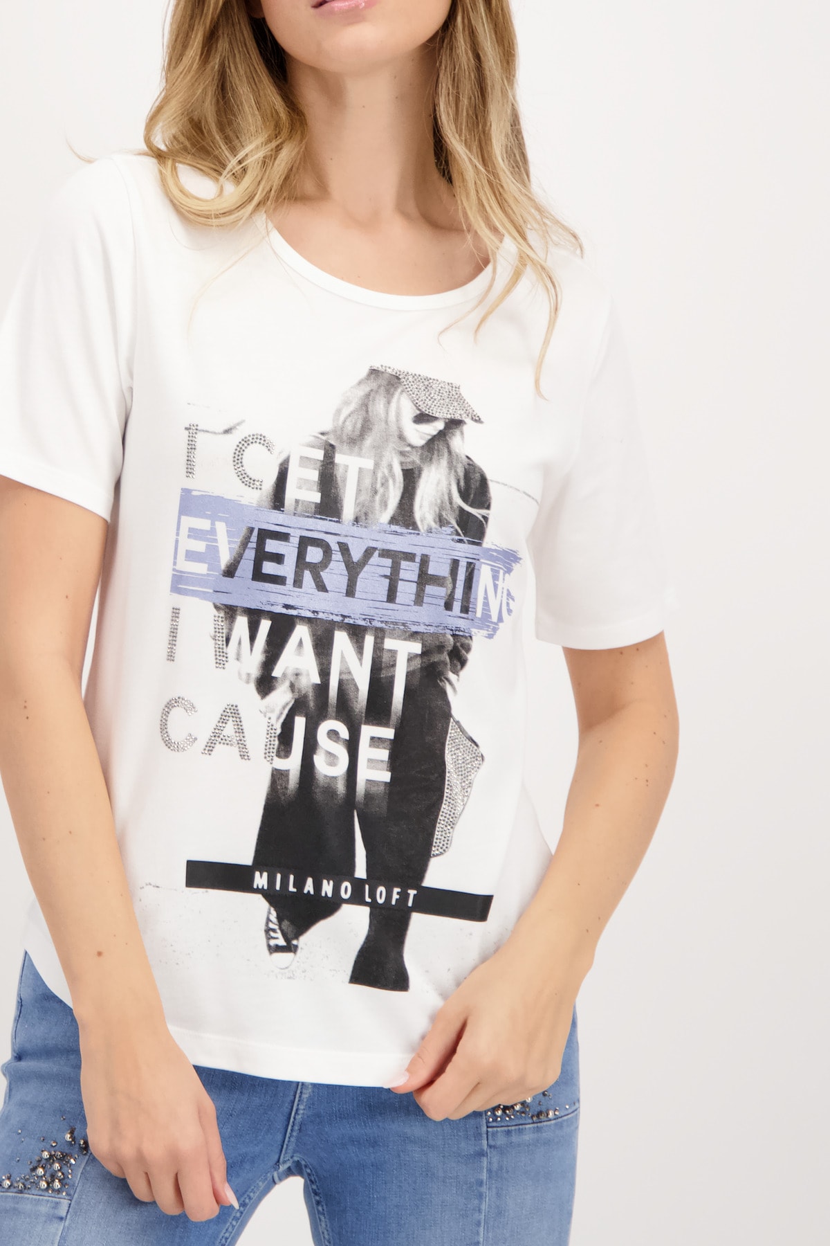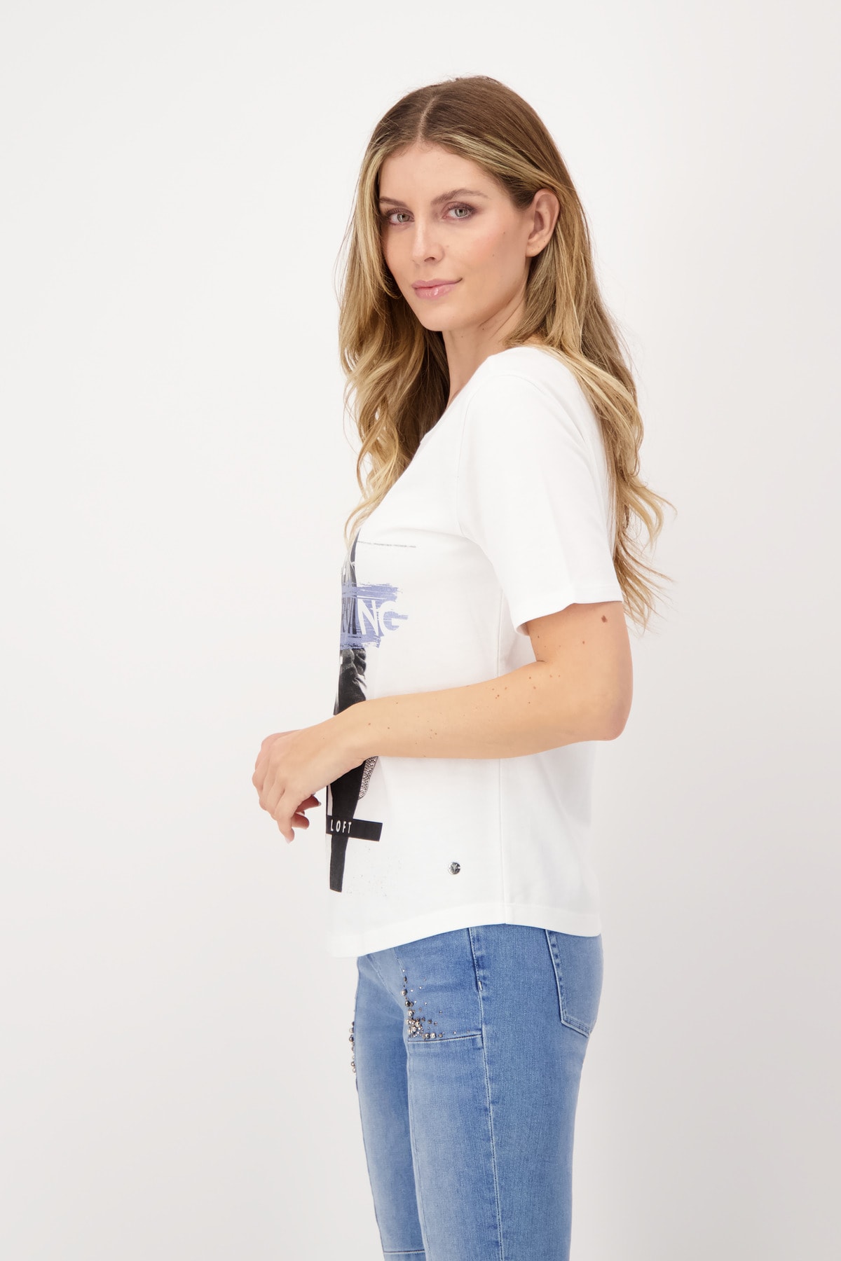 На сайте указаны российские размеры. Футболка с коротким рукавом с фотопринтом и стразами. Модель слегка приталена, имеет половинчатый рукав и круглый вырез горловины. В то время как фотопечать женщины украшена сверкающими стразами, надпись со сверкающими стразами придает женственной рубашке безошибочную изюминку. Смесь хлопка и модала гарантирует, что вы будете чувствовать себя абсолютно комфортно в этой белой рубашке с принтом. Чтобы сделать образ модным, советуем сочетать его со стильными джинсами облегающего кроя и украшениями. Длина по спинке 44 размера составляет 64 см. Модель ростом 178 см
