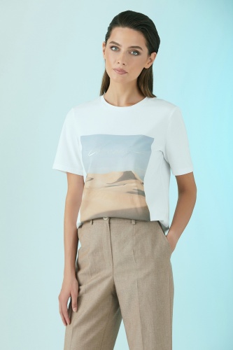Белая футболка с принтом "Пустынное поле" и надписью на груди.