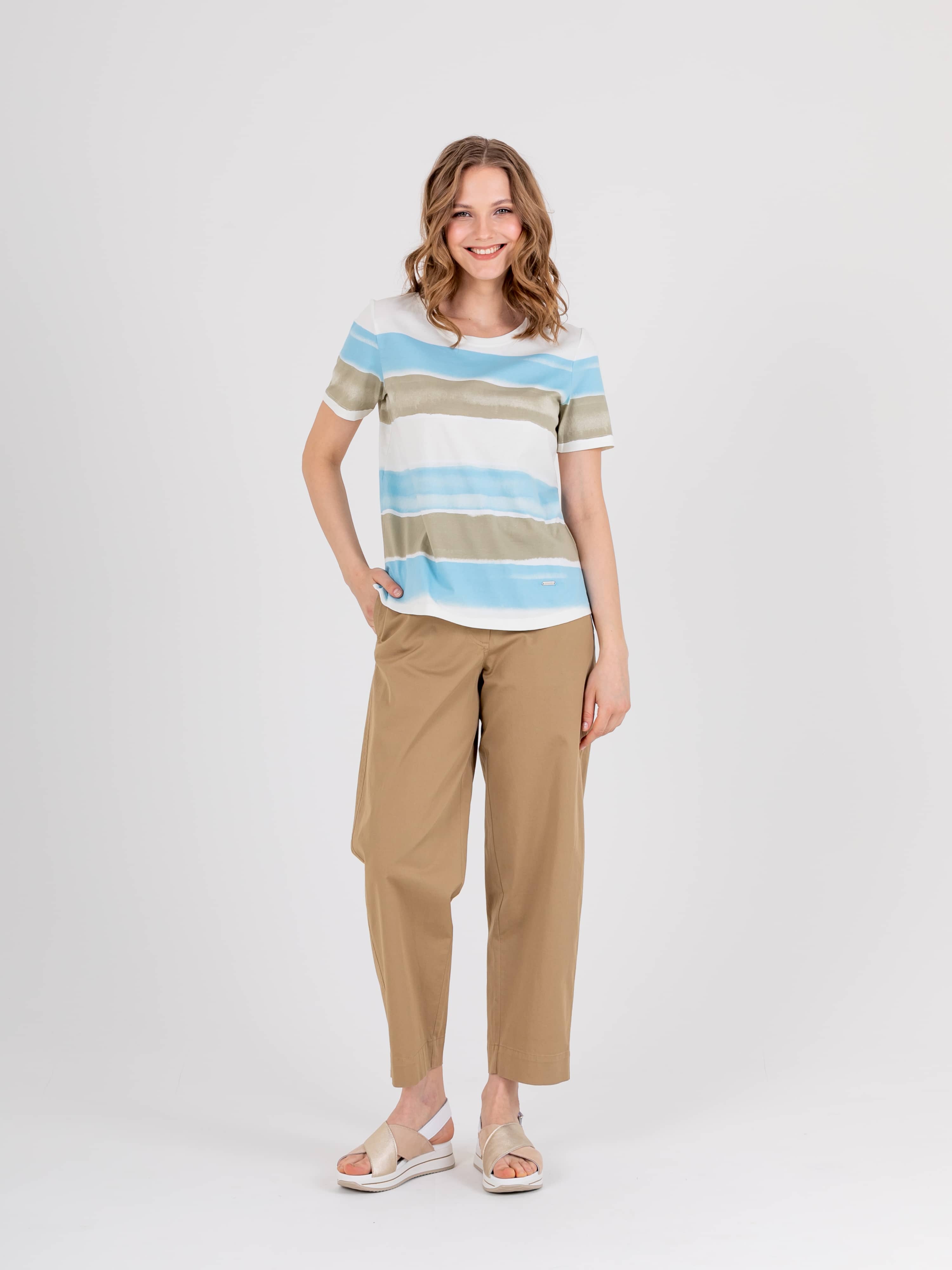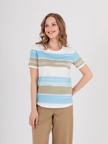 Футболка средней длины прямого силуэта из легкого 100% хлопка с разрезами в боковых швах, дизайнерская особенность модели – нежный принт в полоску. Укороченные втачные рукава. Круглый вырез горловины.