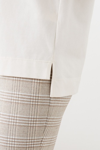 Футболка прямого силуэта, выполнена из трикотажного полотна. Овальный вырез горловины. Слегка спущенная линия плеча с небольшими цельнокроеными рукавами. Удлиненная спинка, боковые швы заканчиваются разрезами. Спереди выполнен дизайнерский принт «Городские мотивы», декорированный пайетками и стразами.