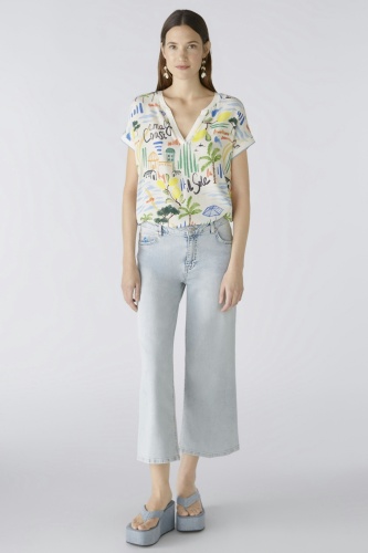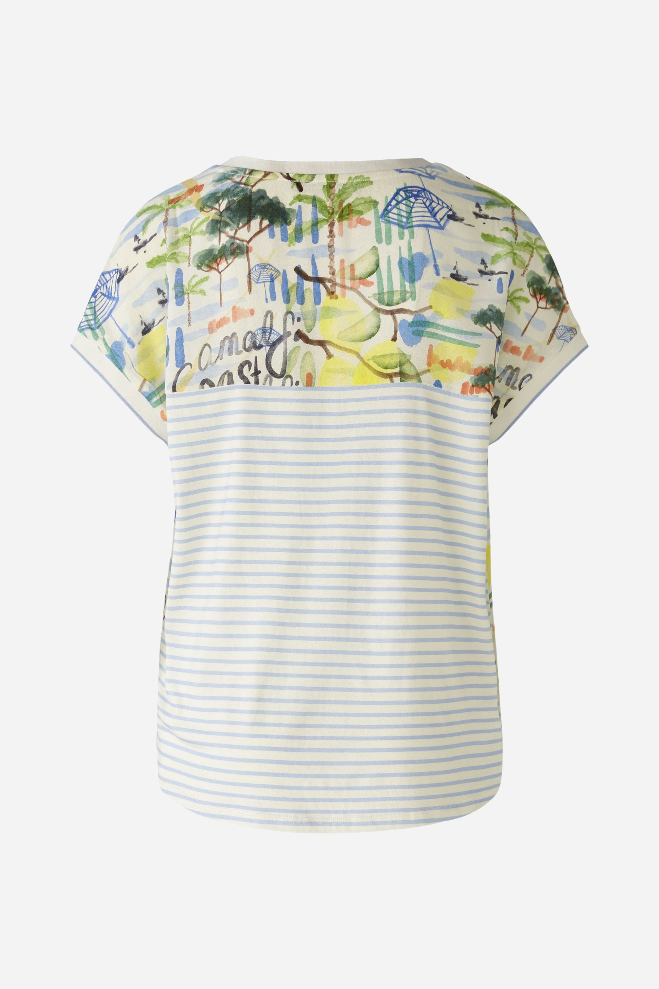 Блузка-рубашка - тканая блузка спереди с принтом oui exclusive, вдохновленным типичным ощущением отпуска на ривьере - удобная вставка из джерси с полосками сзади. Тканый вискозный креп спереди, трикотажная вставка сзади из эластичной смеси вискозы и хлопка. Повседневный крой, стандартная длина. Туника с вырезом. Ребристые манжеты на шее и рукавах. Закругленный низ, расширенный сзади. Каждая часть уникальна. Длина для размера 42: 64 см.