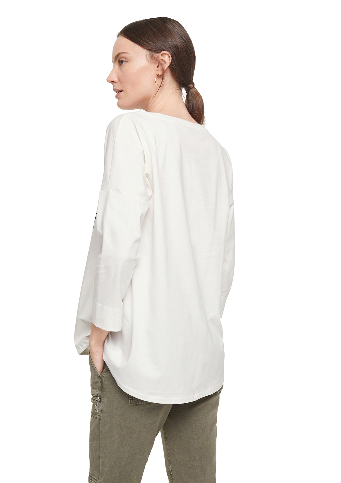 Футболка с принтом. Втачной рукав ¾ со спущенной линией плеча. Кулиска по низу изделия. Материал из смесового хлопка приятен к телу и комфортен в ношении.