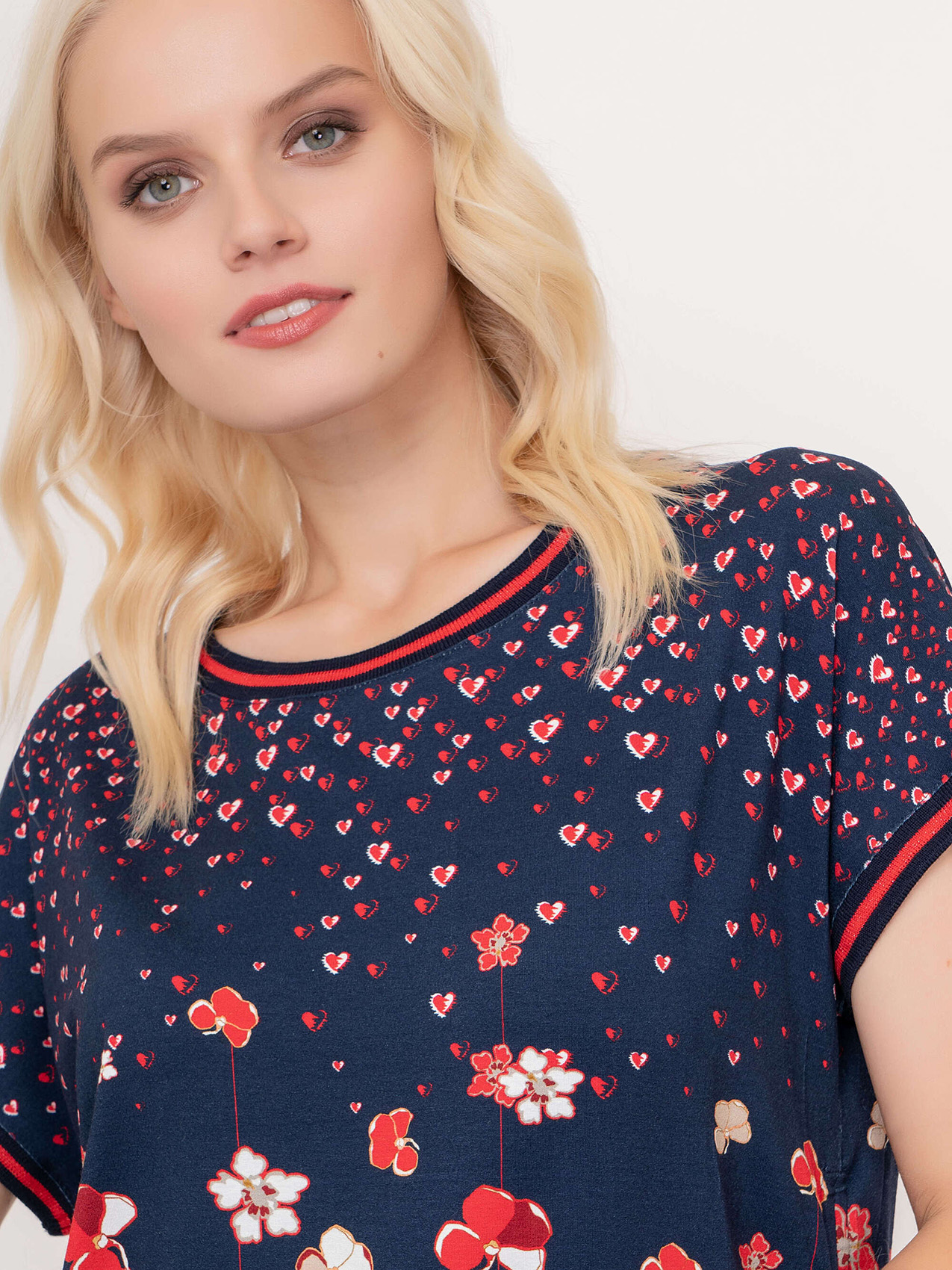 Эта футболка привлекает внимание контрастным принтом. Полуприлегающий силуэт. Круглый вырез горловины и короткие цельнокроеные рукава обработаны контрастной обтачкой в полоску. Еще одна особенность дизайна - кулиска в левом боковом шве, что позволяет регулировать длину и создать красивые драпировки. Приятный к телу материал из вискозной смеси обеспечивает комфорт в ношении.