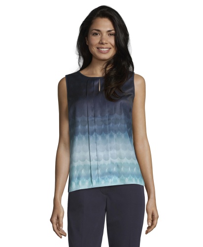 В этом топе привлекает внимание абстрактный принт с эффектом градиент. Спинка изделия выполнена из однотонного темно-синего материала. Горловина "замочная скважина". Приятный к телу материал из вискозной смеси. Данная модель отлично смотрится как с брюками, так и с юбкой-карандашом.