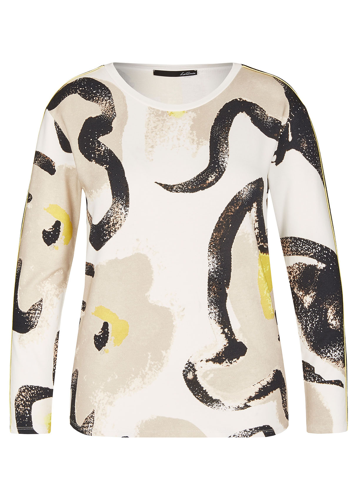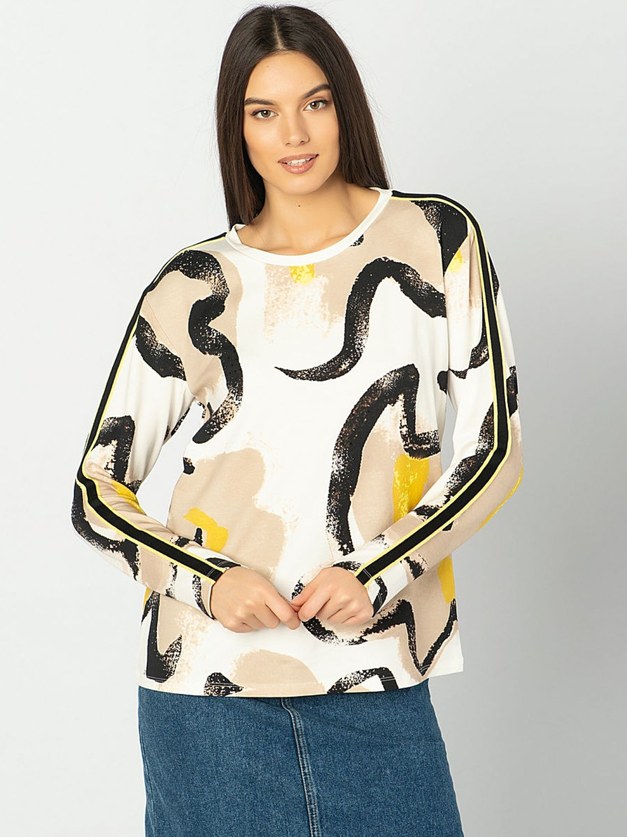 Футболка-лонгслив. Трендовый абстрактный принт. Слегка приталенный силуэт. Декоративная лента на плечах и рукавах. Материал из смеси хлопка, модала и эластана обеспечивает комфорт. Длина изделия по спинке: 65 см.