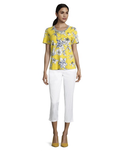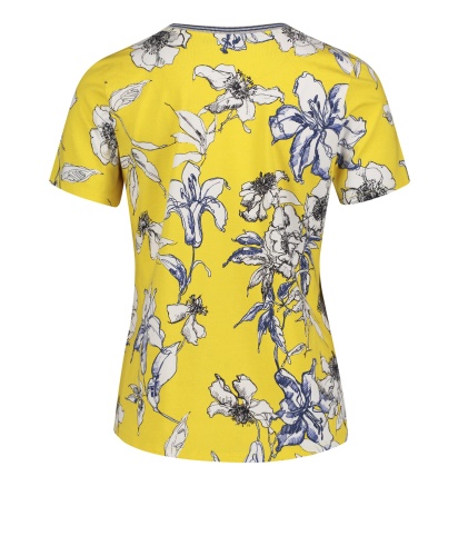 Цветочный принт - хит теплого сезона! Футболка прямого покроя. Круглый вырез горловины с обтачкой, короткие рукава. Материал из вискозной смеси приятен к телу и обеспечивает комфорт. Эта женственная модель прекрасно смотрится как с брюками, так и с юбкой.