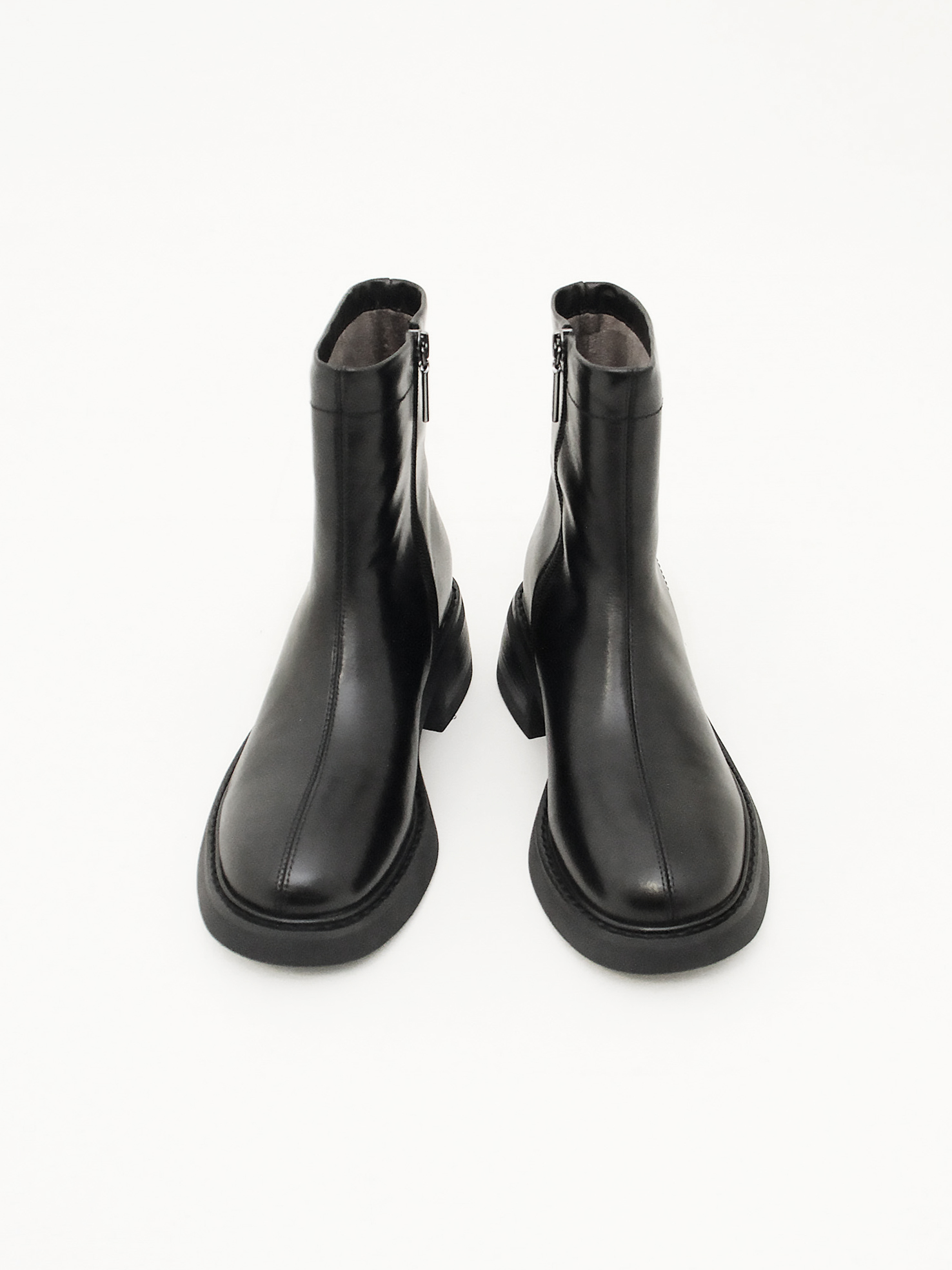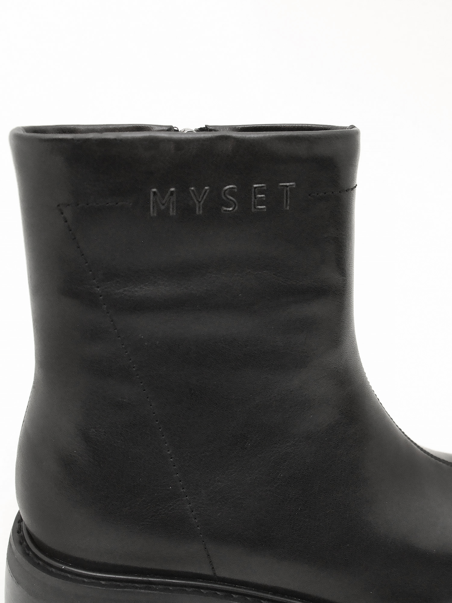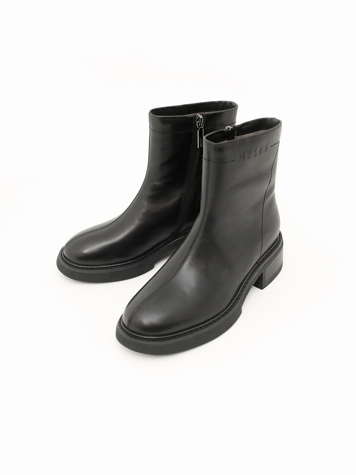 Трендовая, утепленная байкой модель, демисезонных ботинок из натуральной кожи на толстом устойчивом каблуке. На внешней стороне ботинок с помощью тиснения нанесено название бренда MYSET.