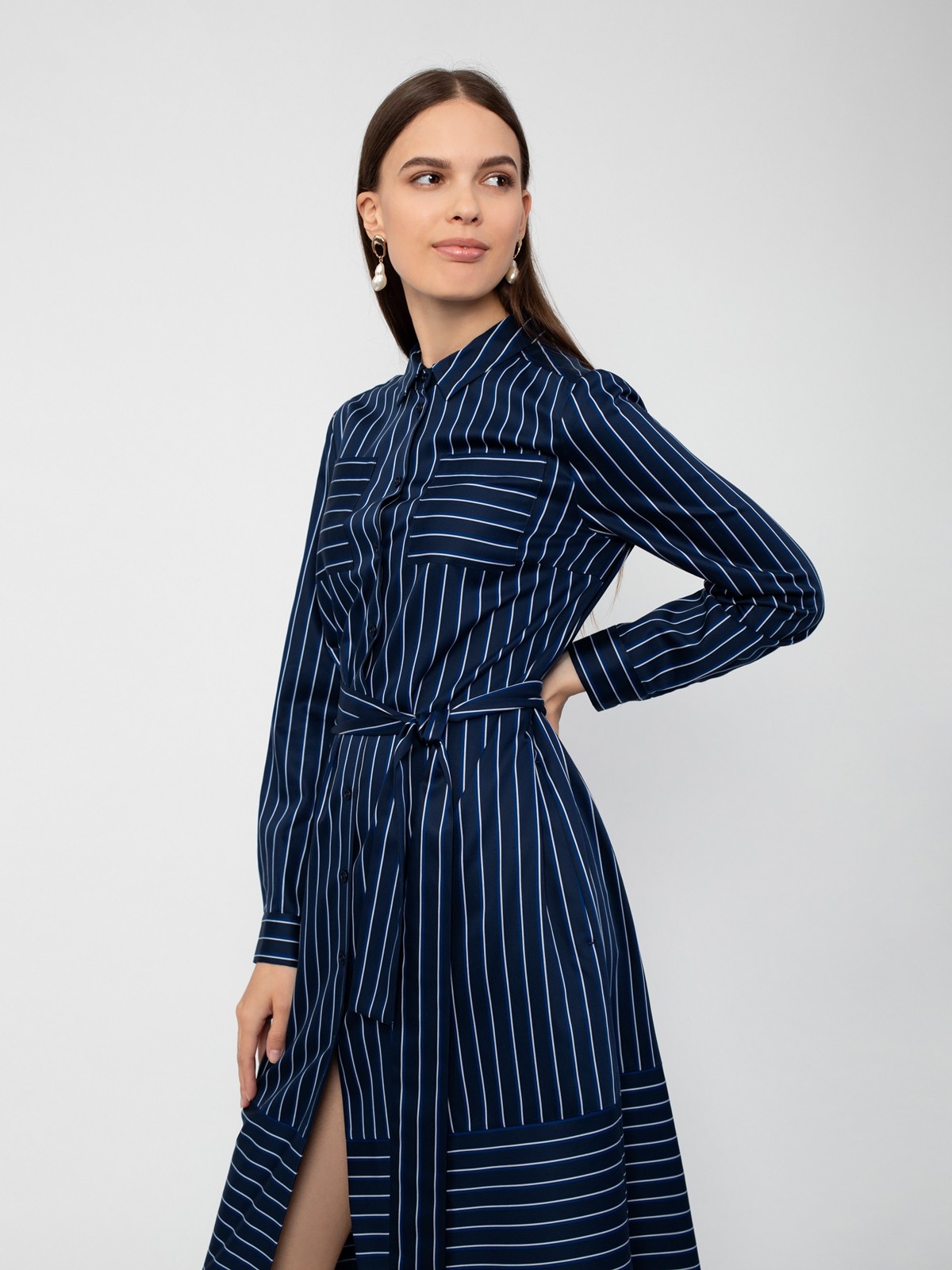 Платье в полоску длины миди прямого силуэта с классическим отложным воротником и втачным рукавом полной длины с манжетами. Спереди застежка на пуговицы и прямоугольные накладные карманы. На талии съемный пояс из основной ткани.