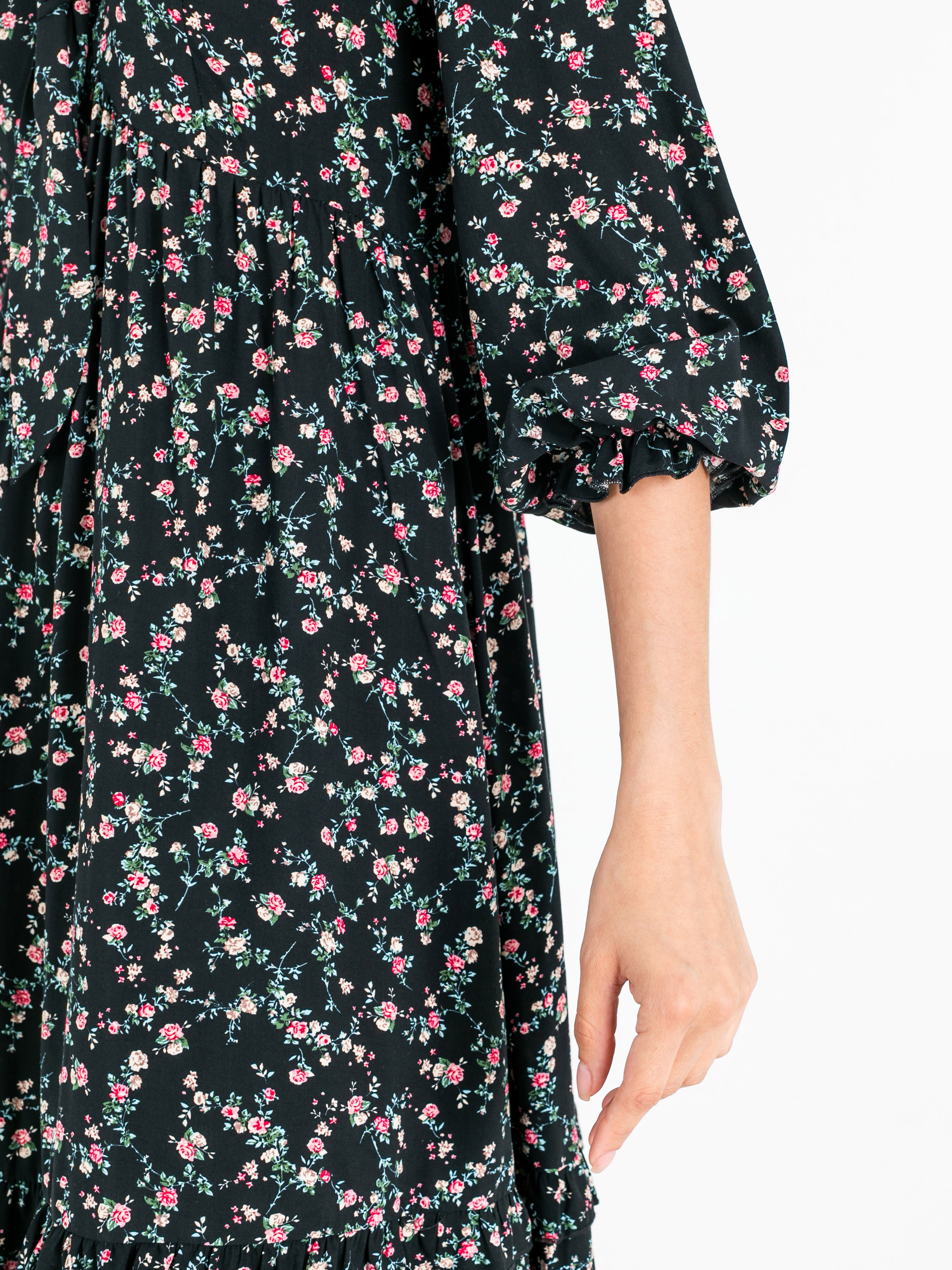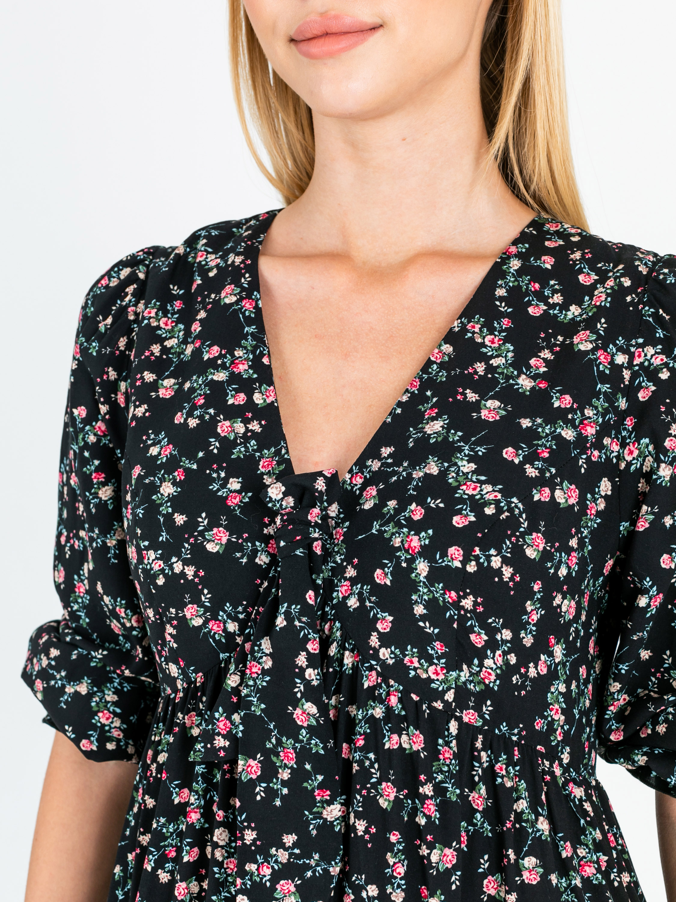 Приталенное платье с цветочным принтом. V-образный вырез с завязками. Рукав 2/4 на резинках.