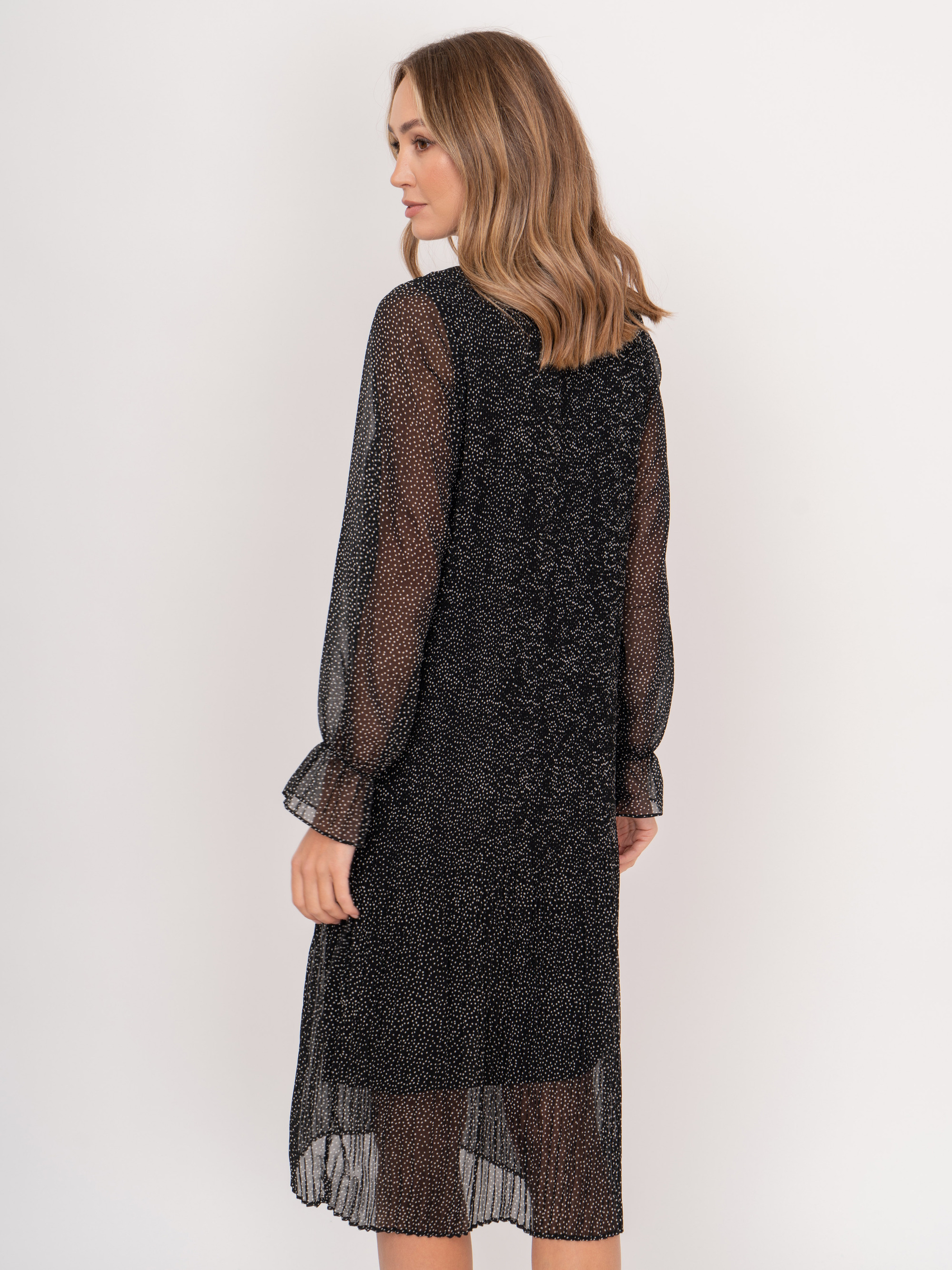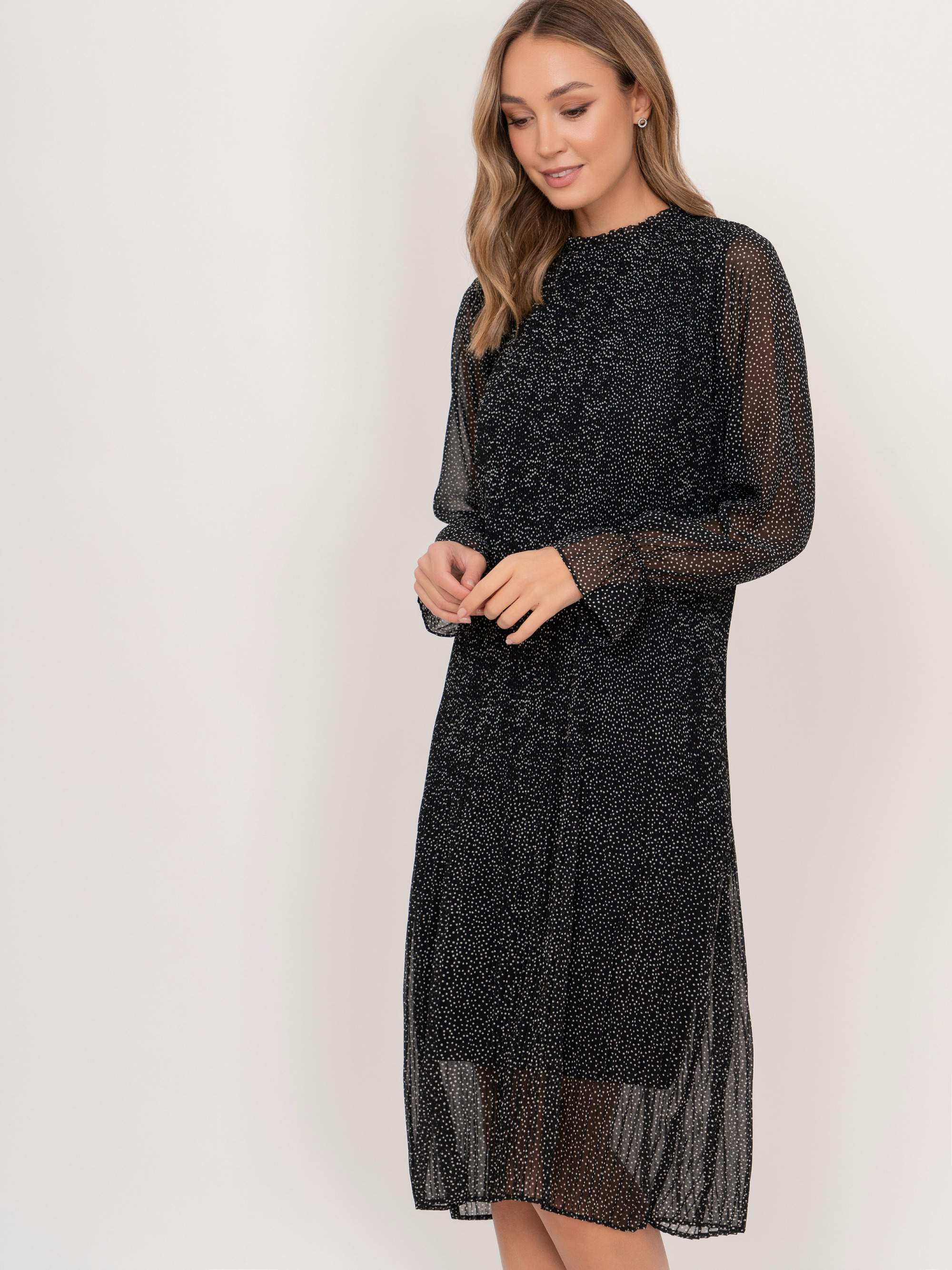 На сайте указаны российские размеры. Полупрозрачное черное миди платье трапеция в белый горох с круглым воротником, с длинным рукавом. Горловина и рукава дополнены воланами. Рост модели: 175 см. Длина платья: 110 см.
