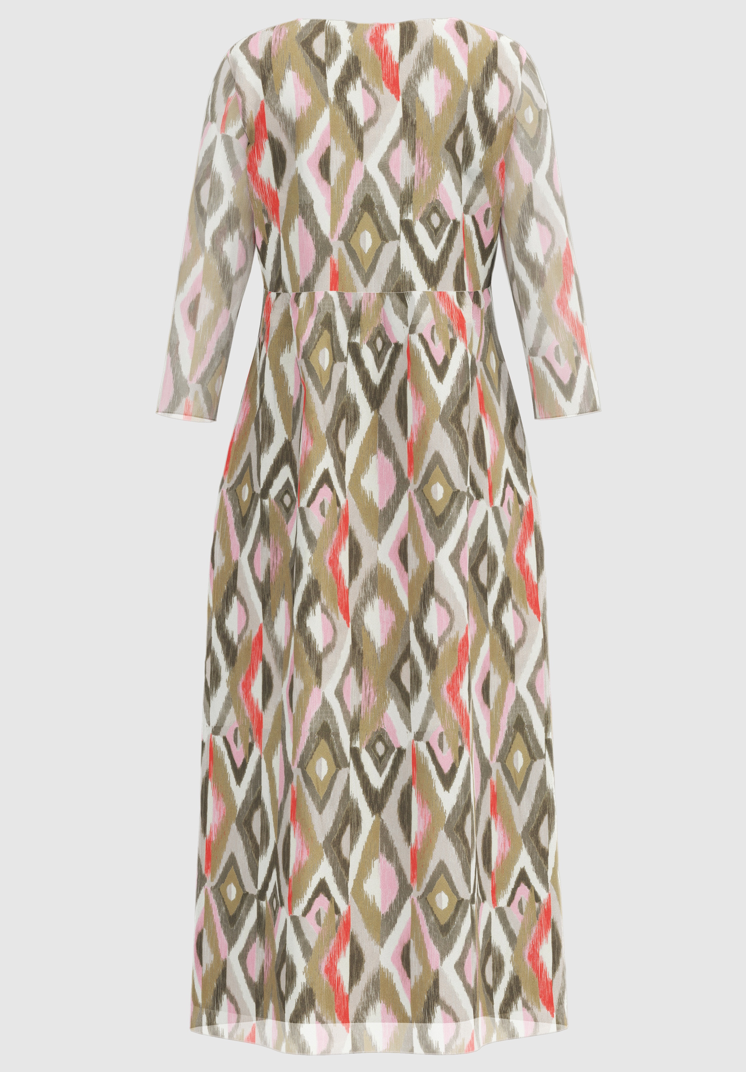 На сайте указаны российские размеры. Платье макси с V-образным вырезом и прозрачными рукавами 3/4. Высококачественный полиэстер с эластаном, подкладка из джерси. Деталь с пуговицами на вырезе. Длина юбки около 78 см, рост нашей модели около 180 см.