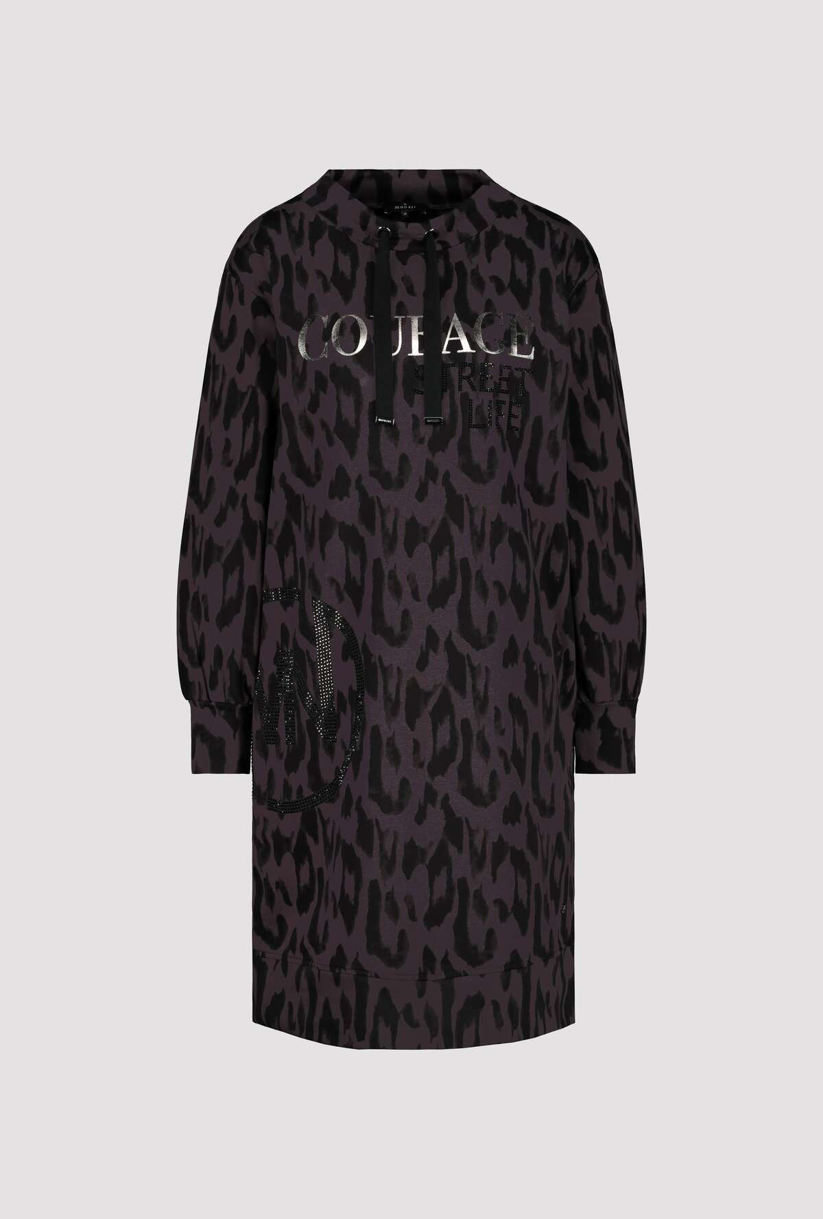 На сайте указаны российские размеры. Спортивное платье миди с воротником-стойкой и принтом по всей поверхности. Это изделие привлекает всеобщее внимание сплошным леопардовым принтом, а лицевая сторона украшена лакированными буквами и стразами, а также сверкающей эмблемой из страз. С воротником-стойкой на кулиске, люверсами и завязками, широкими манжетами с рюшами на концах рукавов и широкой манжетой по низу модель миди прямого кроя предстает с лучшей стороны. Карманы в боковых швах завершают стильный образ. Хлопок в смеси также обеспечивает отличный комфорт при ношении в течение дня. Модель ростом 178 см. Длина спины 44 размера составляет 96 см.