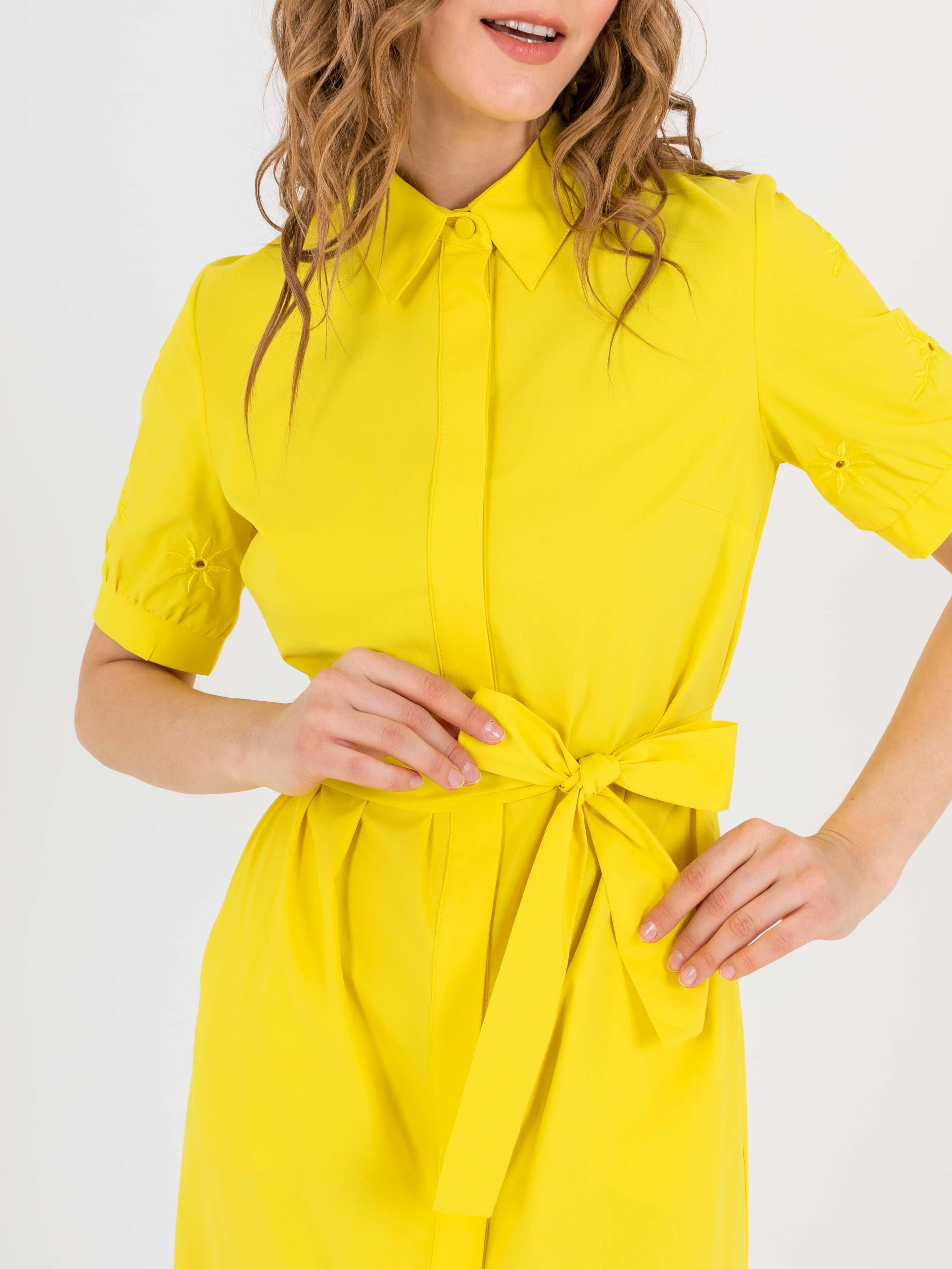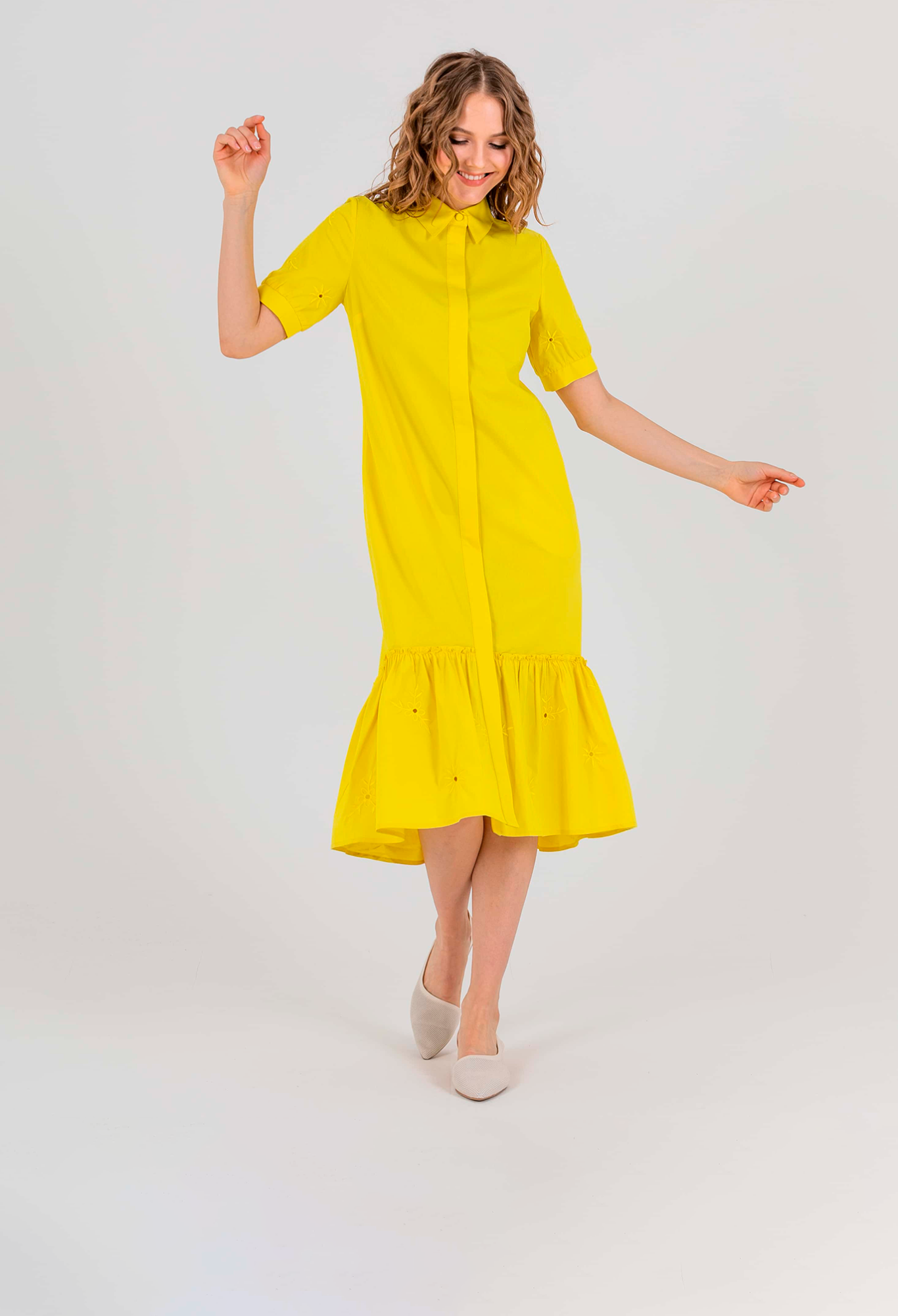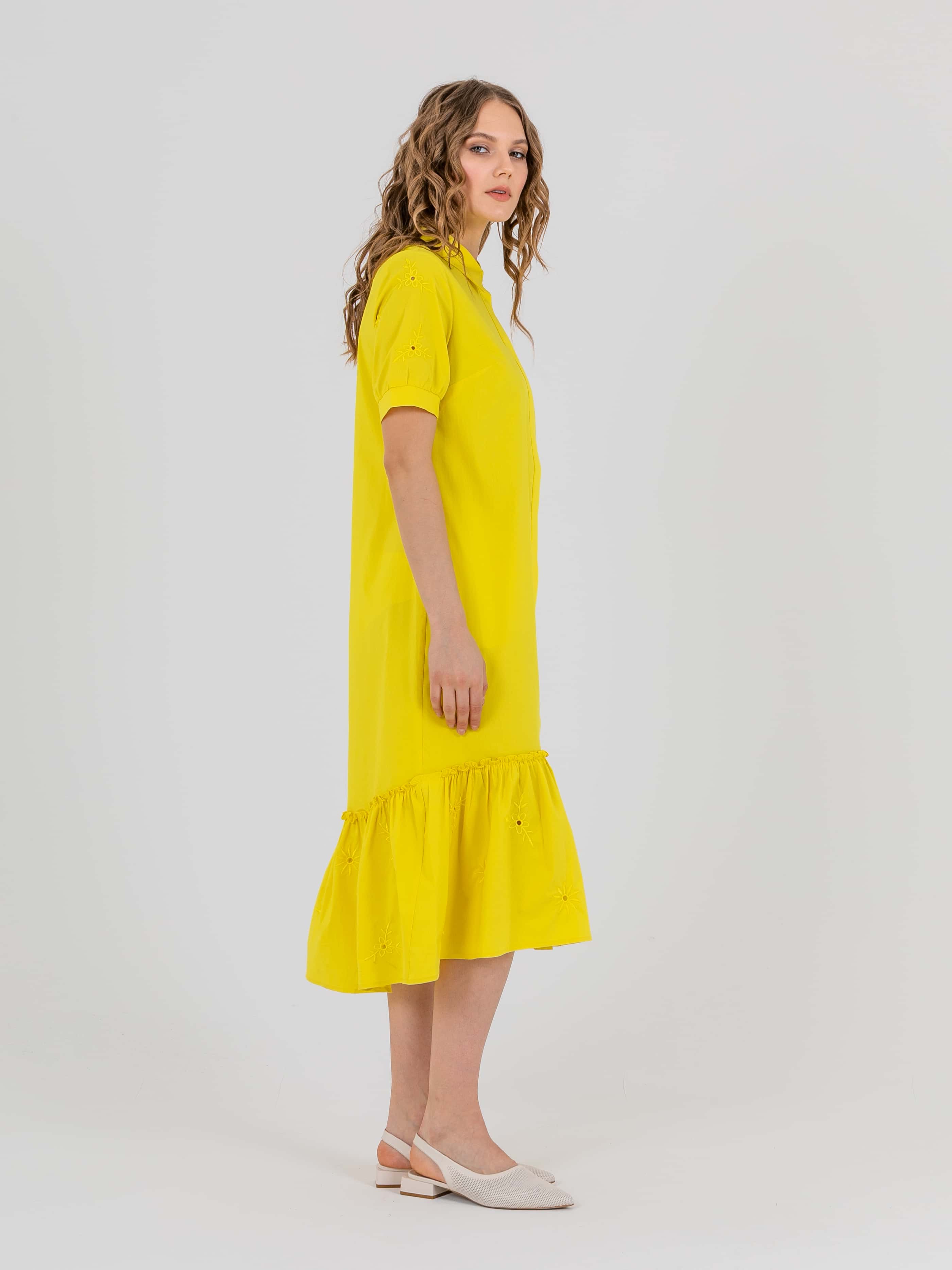 На сайте указаны российские размеры. Платье-рубашка А-силуэта длиной midi с оборкой по низу, дизайнерская особенность - потрясающее хлопковые шитьем растительного орнамента, есть съемный пояс. Перед с двумя вытачками на выпуклость груди, идущими из боковых швов. Застежка потайная на 10 пуговиц. Укороченные втачные рукава «фонарик» с манжетами. Стояче-отложной воротник.