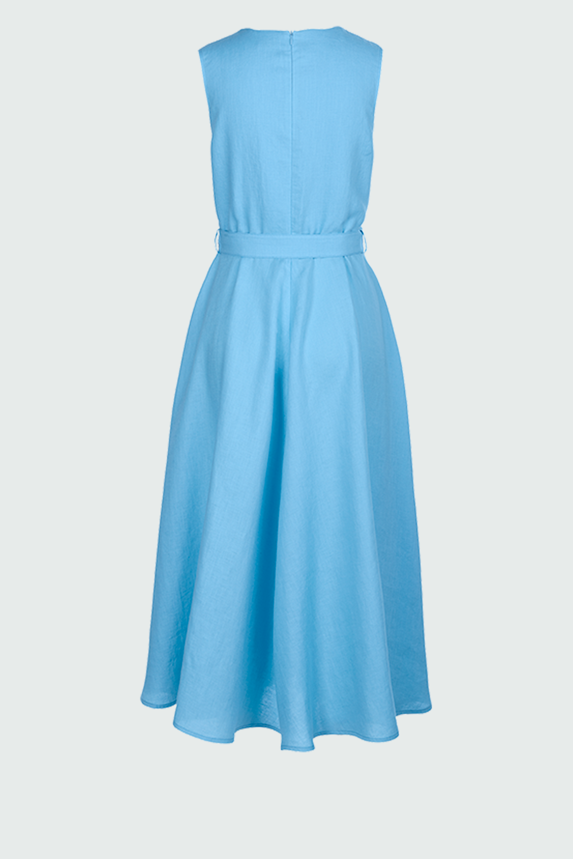 Платье миди без рукавов из льна с запахом, V-образным вырезом и поясом. Еще одна оригинальная деталь — дерзкий разрез на платье, который можно застегивать и расстегивать в зависимости от настроения.