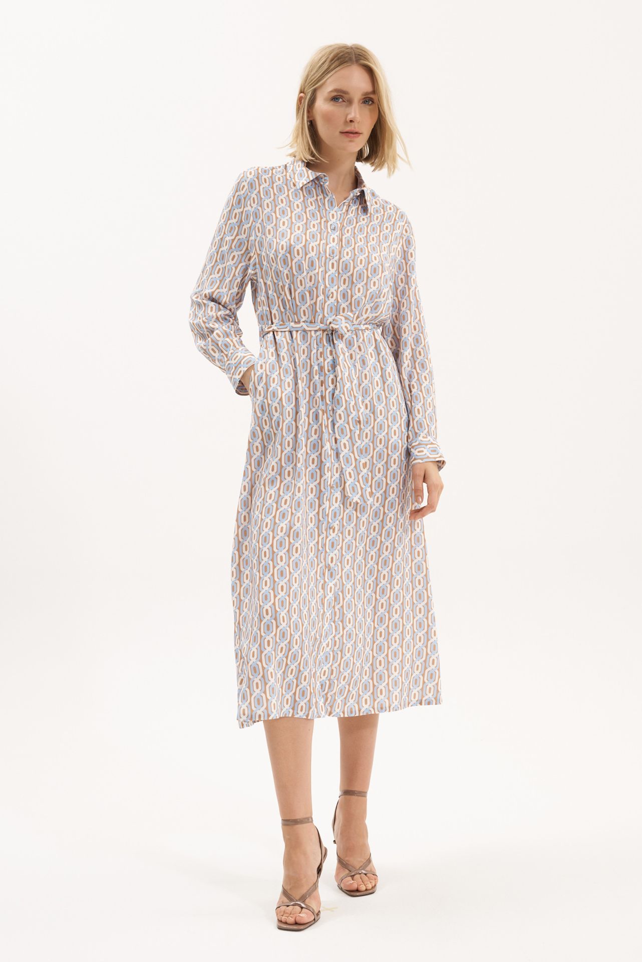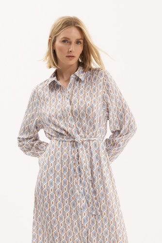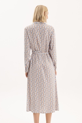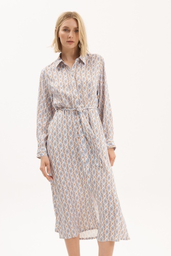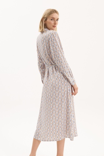 Платье-рубашка с узором из струящегося вискозы. С разноцветным узором решетки медового/небесно-голубого/белого. Свободно разрезан. Юбка-клеш, поясный шов со складками, вставные карманы, ремень. Длина: 130 см.