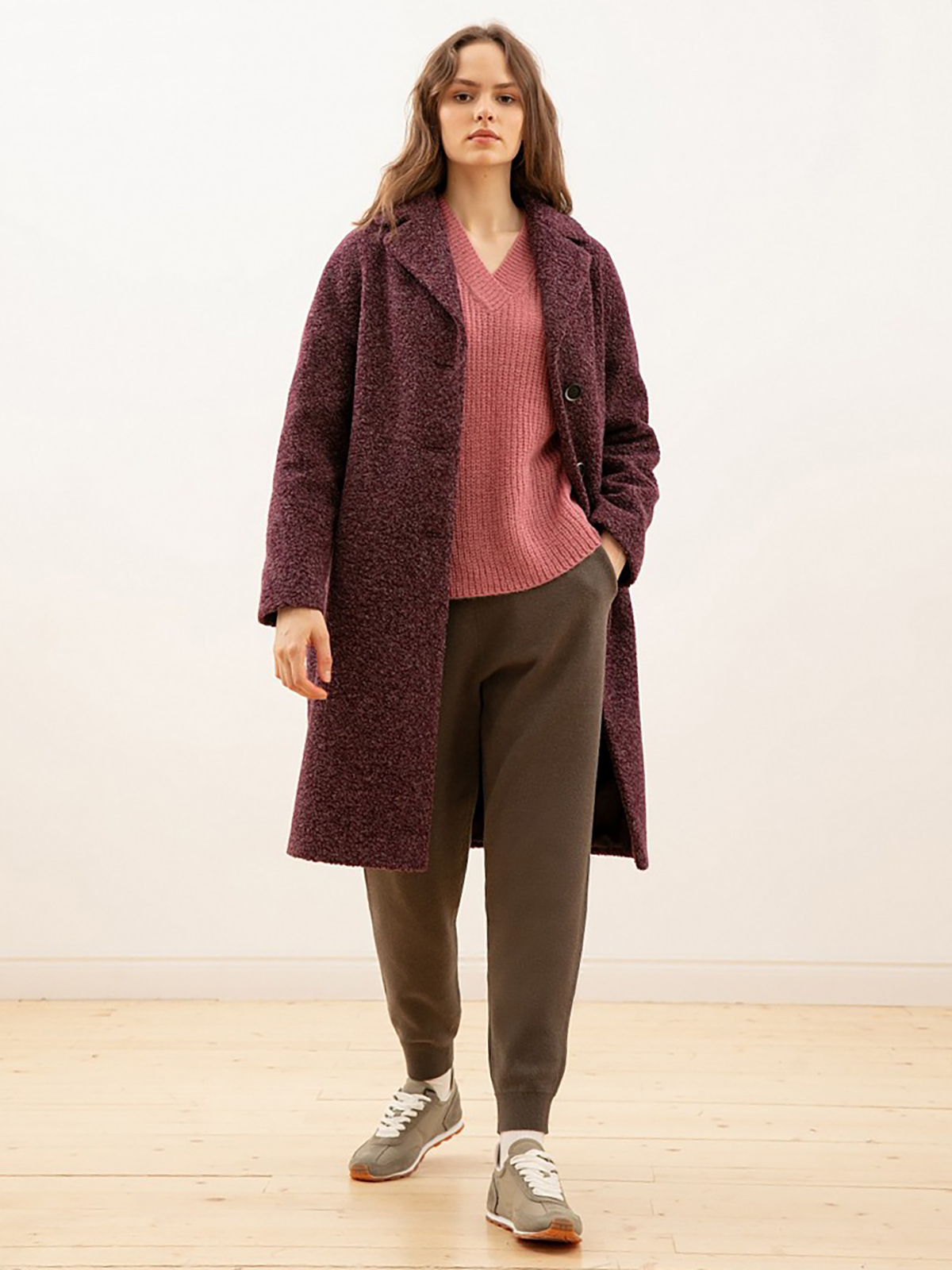 Однотонное повседневное пальто с крупным ворсом. Насыщенный ежевичный задаст тон всего образа. Силуэт кокон, длина ниже колена, застежка на пуговицу и кнопку.