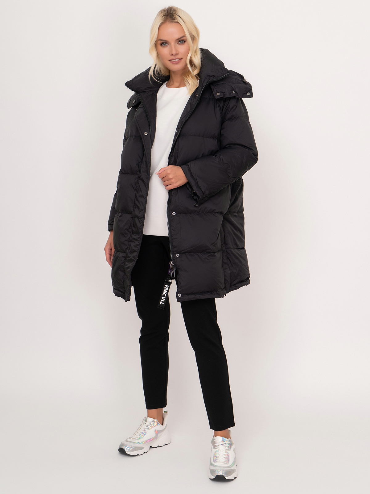 Стеганое однотонное пальто с пуховым наполнителем. Застежка на двойную молнию, ветрозащитная планка со скрытыми кнопками. Объемный капюшон, воротник стойка. Стильный базовый вариант пуховика, хорошо сочетается с различными нарядами.