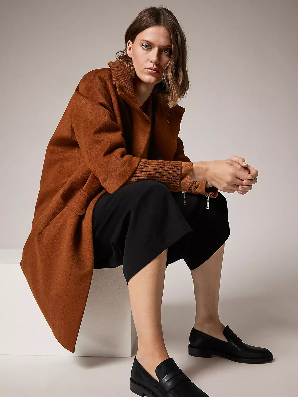 Однотонное драповое демисезонное пальто коричневого оттенка. Материал из смесовой шерсти. Супатная застежка на кнопки. Длинные втачные рукава с широкими трикотажными манжетами в рубчик. Высокий воротник стойка в рубчик. Боковые карманы с клапанами.