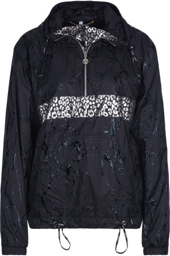 Анорак с анималистичным принтом по всей поверхности изделия. Модель украшают серебряная полоска на груди и спине. Дышащая сетка внутри куртки. Карман-клатч, молния на груди, капюшон и подол на кулиске делают образ одновременно элегантным и спортивным. Идеальная вещь для прогулок в городе и на природе.