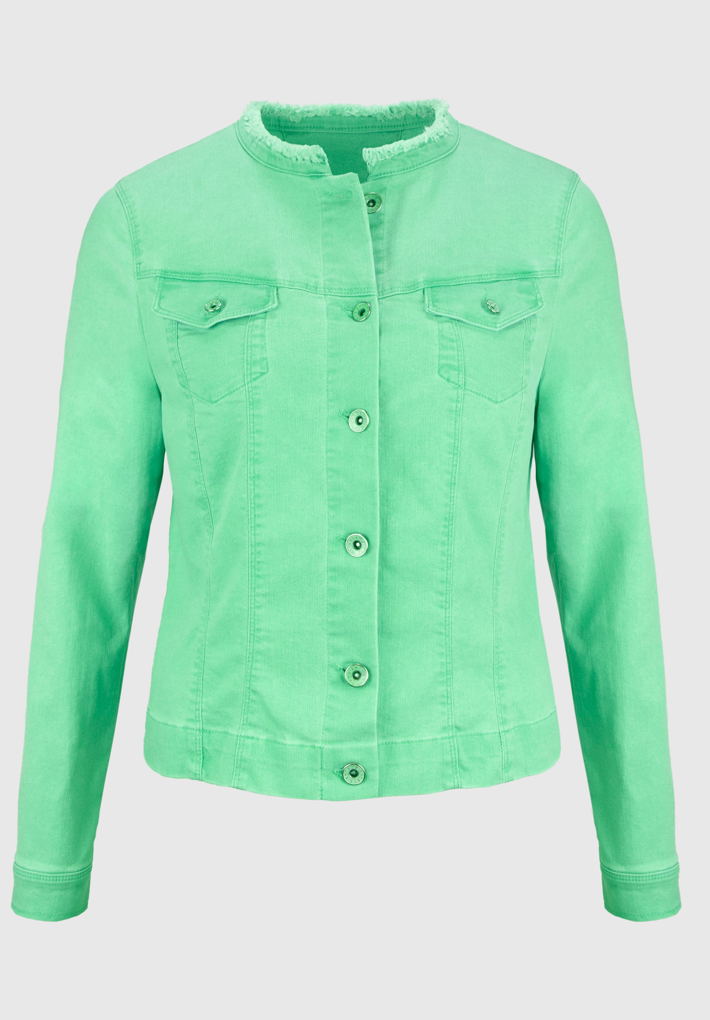 На сайте указаны российские размеры. Джинсовая куртка с особым воротником с бахромой. Благодаря сочетанию высококачественных материалов с эластичным эластаном, она очень удобна в носке и повторяет каждое движение. Планка на пуговицах спереди и особый воротник с бахромой, а также накладные нагрудные карманы делают эту модель абсолютно привлекательной. Длина в размере 44 около 54 см.