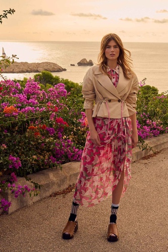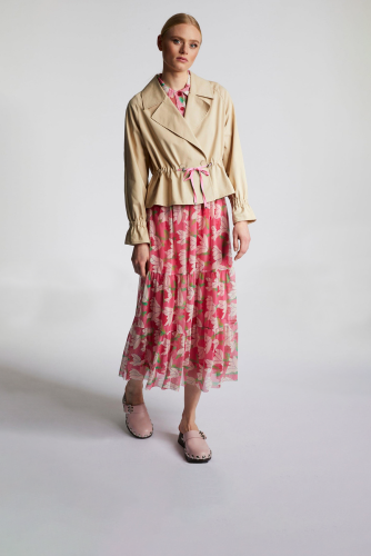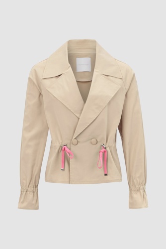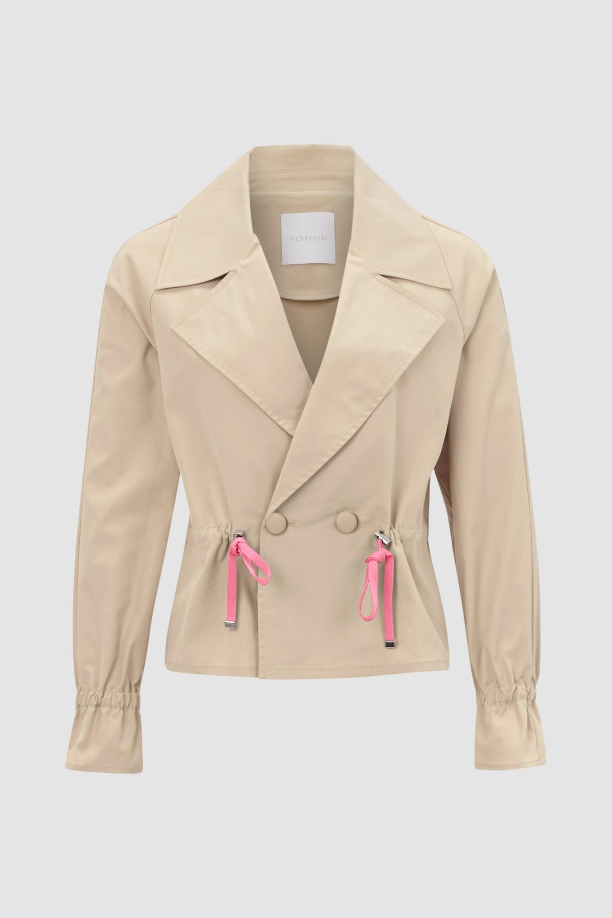 Двубортный жакет в спортивном повседневном стиле. Большой лацкан и контрастная цветная завязка на талии привлекают внимание. Широкие рукава реглан красиво завершаются эластичными вставками.
