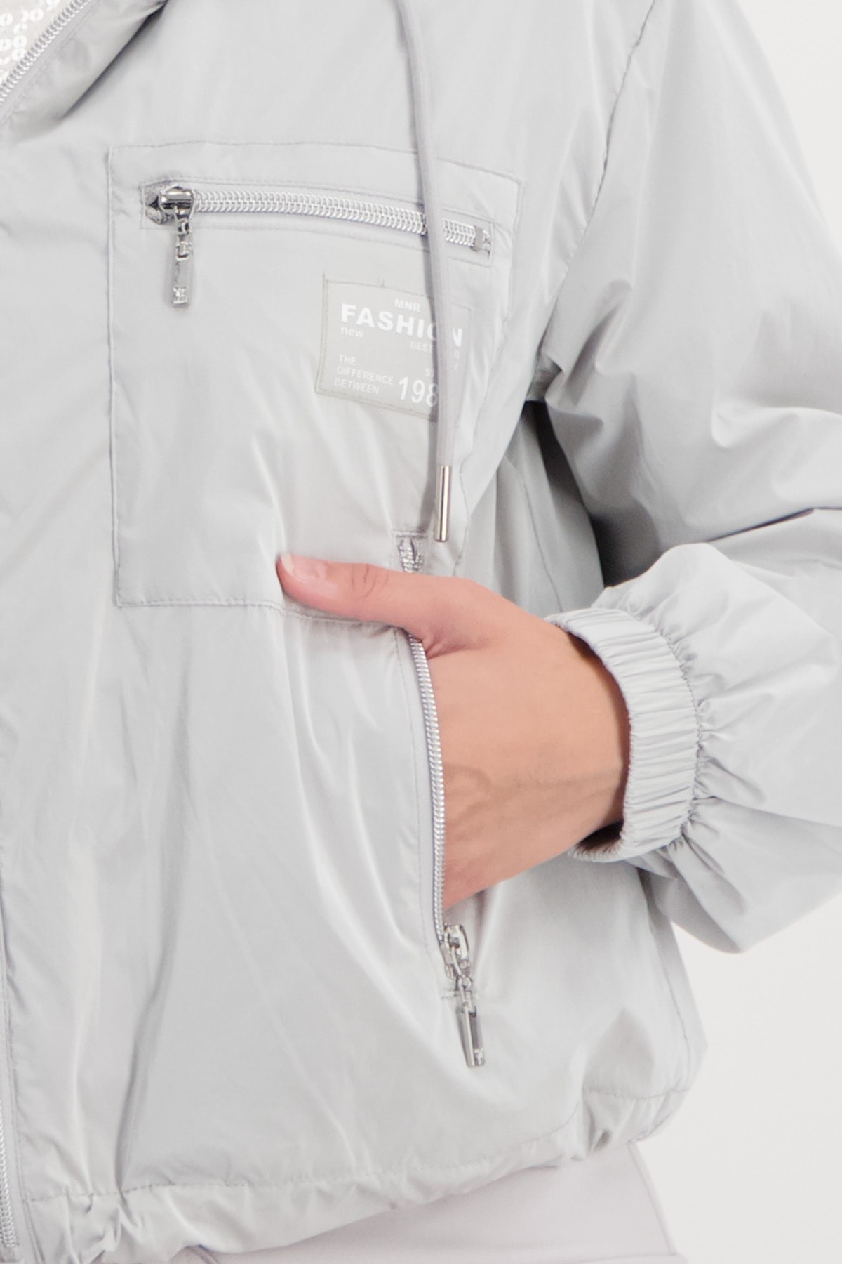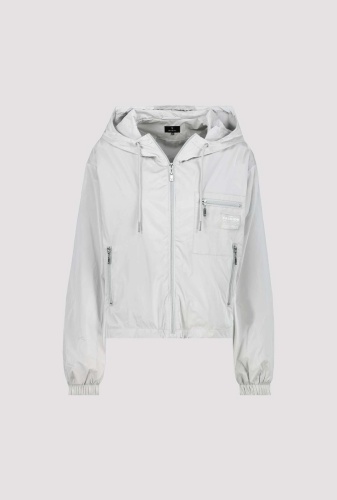 Блестящая куртка из нейлоновой ткани. С нашивкой и надписью. Мерцающее покрытие. Патч с надписью. Регулярная посадка. Капюшон с ремешком. Слегка перекрывающиеся длинные рукава. Подол рукава на резинке. Открытый карман на молнии. По низу потайная резинка с фиксатором шнура. Длина 44-го размера по спинке — 54 см, длина по переду — 56 см.
