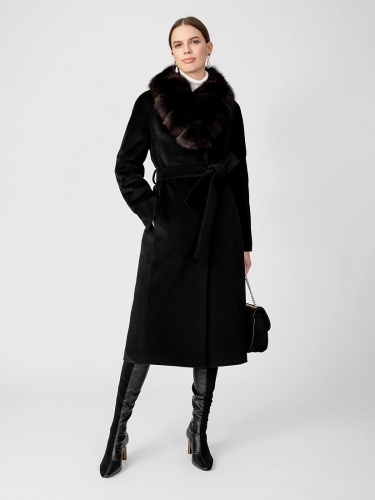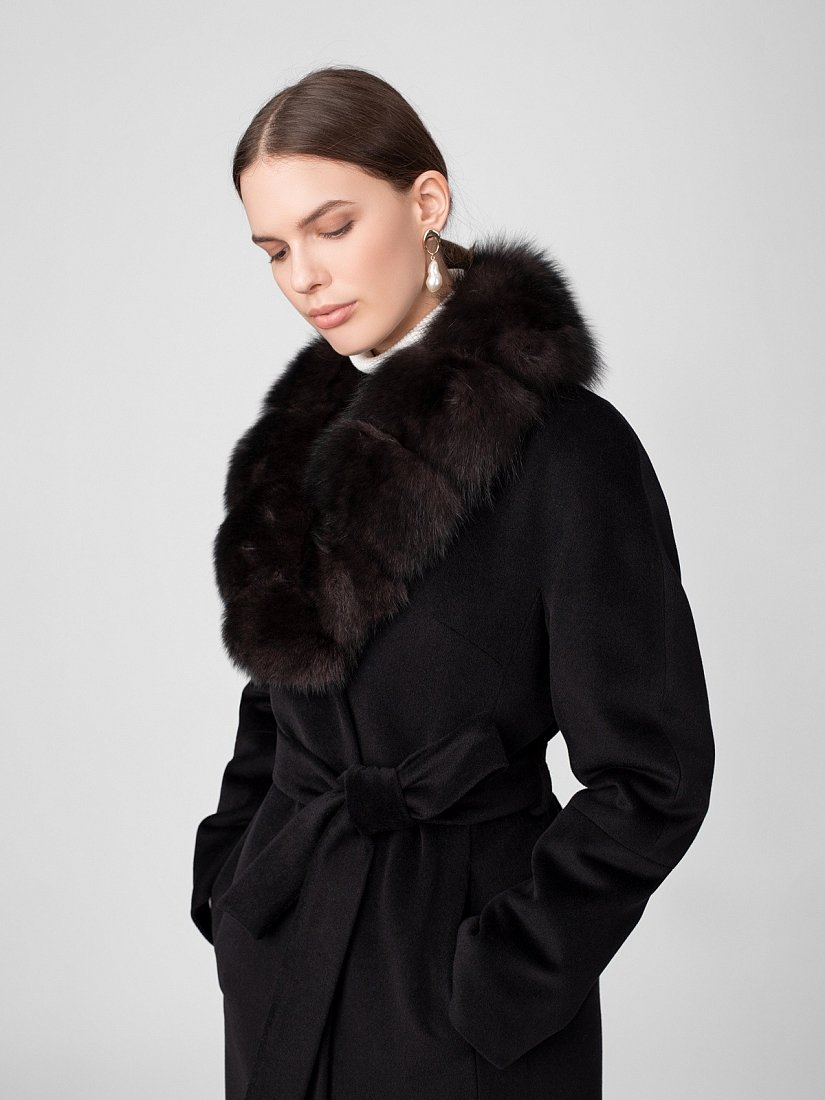 Пальто прилегающего силуэта из шерстяной ворсовой ткани чёрного цвета со съёмным воротником из натурального песца в росшив. Длина ниже колена. Рукава-кимоно с подрезом по низу, застёжка на пришивные кнопки, карманы в рельефах, английский воротник, пояс, шлица в среднем шве спинки. Произведено с ветрозащитной мембраной Raft Pro. Утеплитель DuPont Sorona из биопуха.