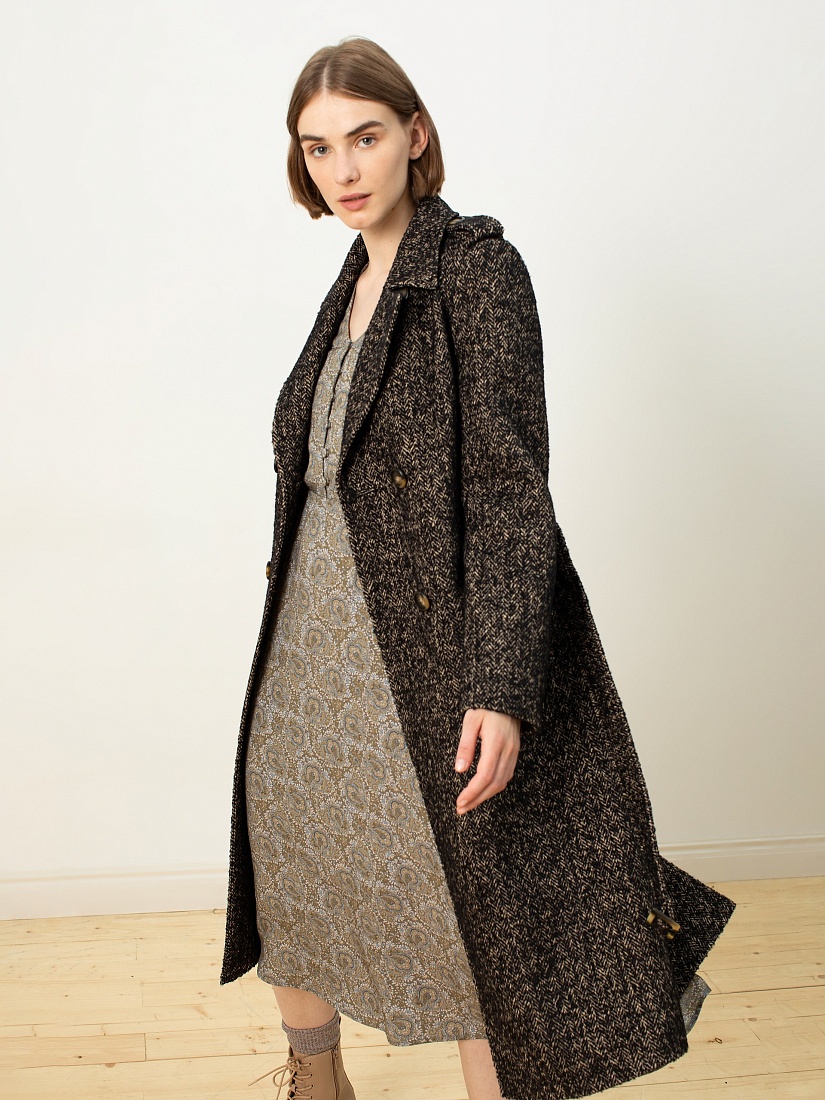 Двубортное пальто полуприлегающего силуэта из шерстяного твида со съемным воротником из искусственного енота. Втачной рукав, застёжка на роговые пуговицы, карманы с клапанами, пояс, шлица, погоны. Изделие декорировано широкой отделочной строчкой.