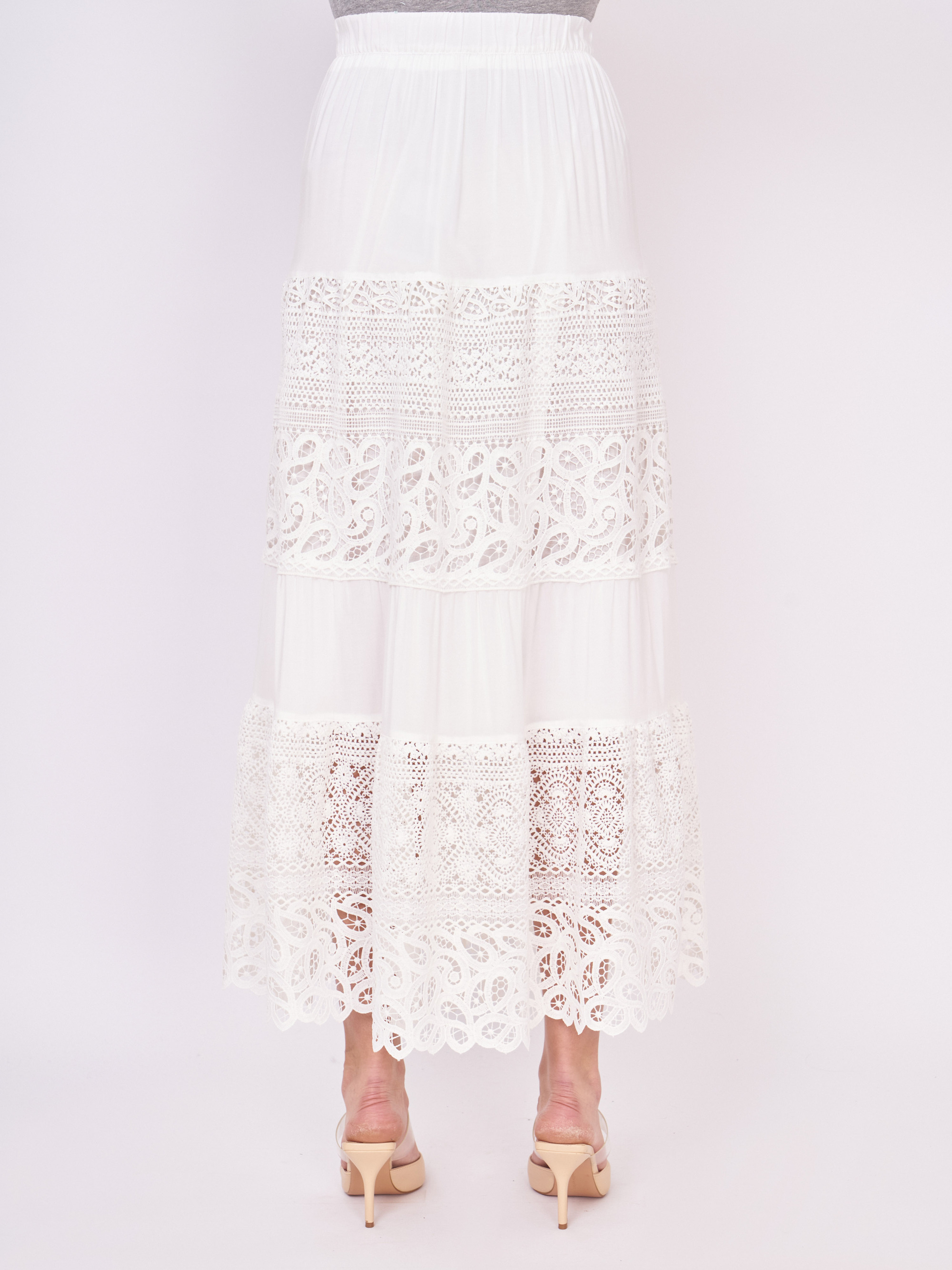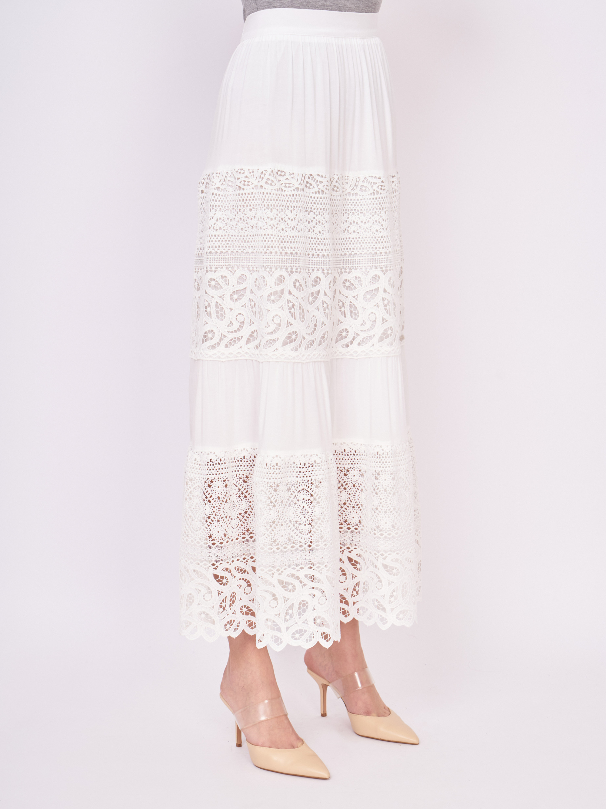 На сайте указаны российские размеры. Текстильная белая макси юбка трапеция на молнии, с кружевными вставками, с воланами. Длина юбки: 97 см. Рост модели: 177 см.