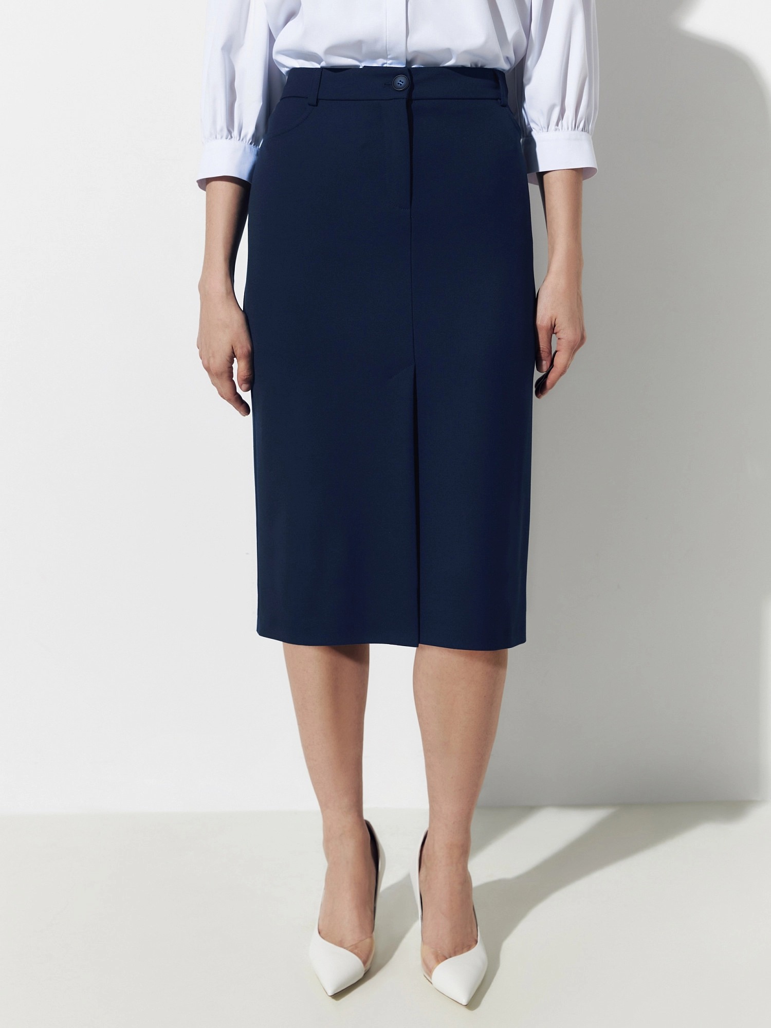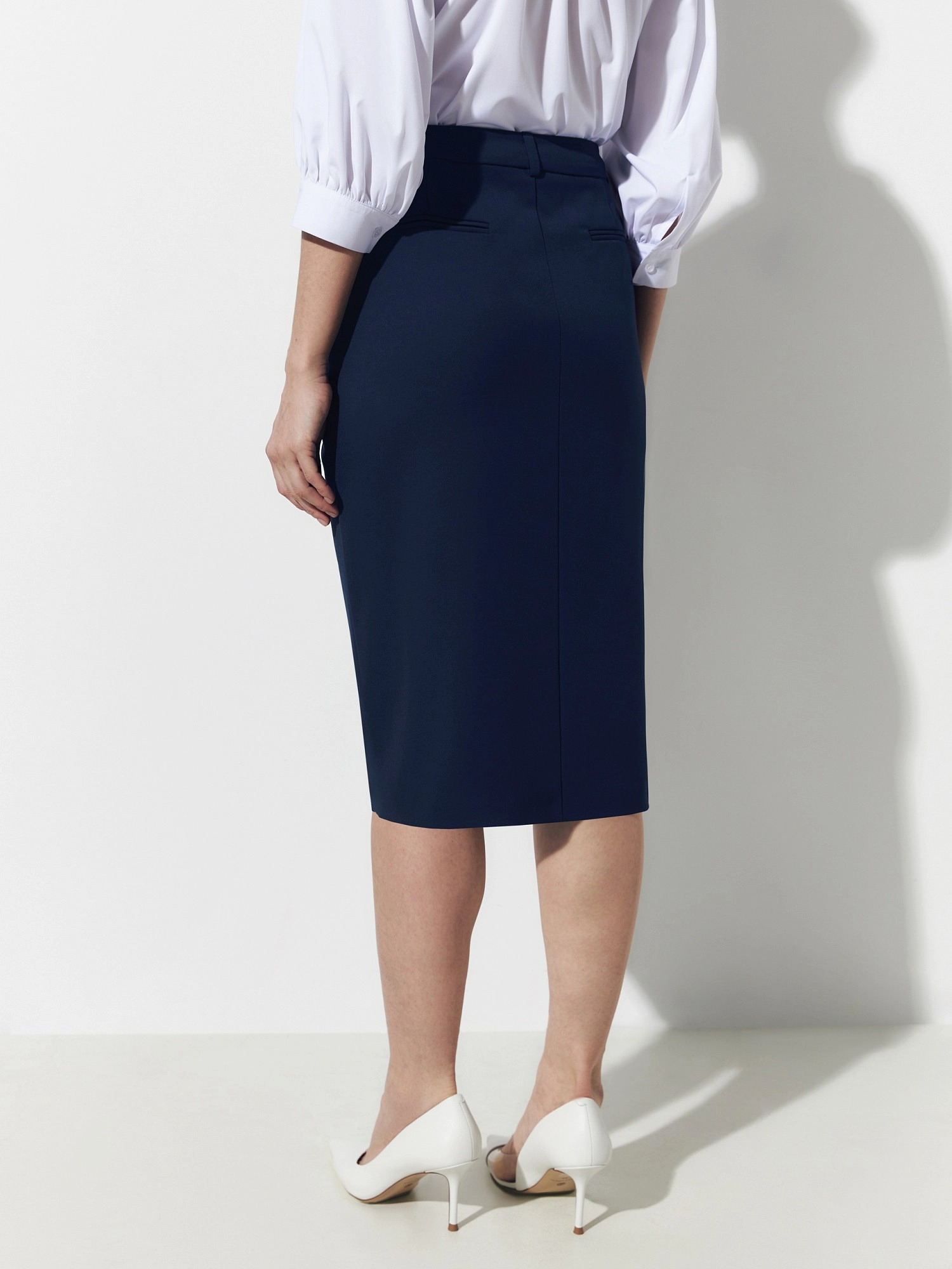 Юбка полуприлегающего силуэта на притачном поясе со шлевками. Выполнена из костюмной ткани с добавлением вискозы. Спереди у юбки имеется шлица для удобства шага. Функциональные карманы джинсовой формы и два ложных прорезных кармана сзади. Юбка составляет хорошую пару с прямым жакетом в полоску из одной капсулы.