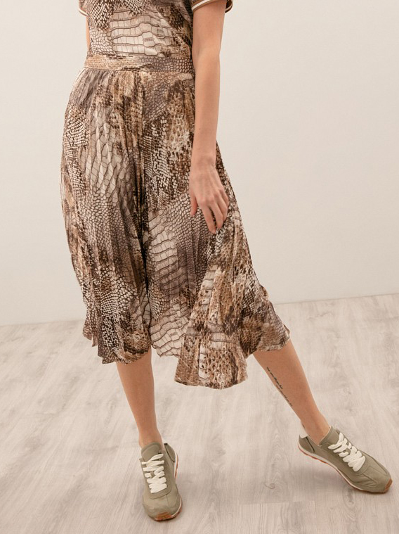 Плиссированная юбка длины миди выполнена в анималистичном узоре. Притачной пояс обеспечивает удобство ношения. Юбка отлично сочетается с футболкой или топом.
