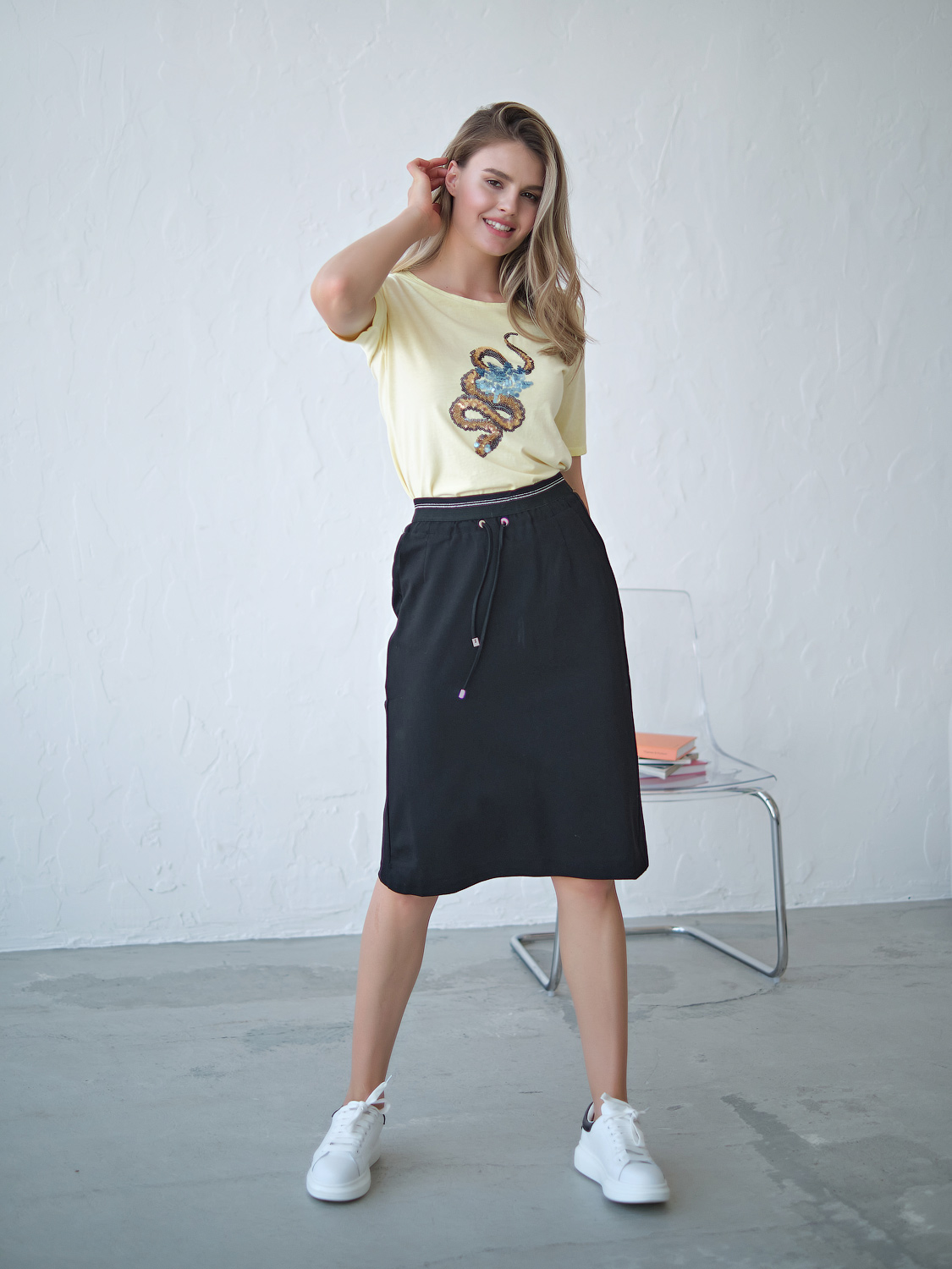 Юбка прямого кроя. Универсальная длина до колена. Прорезные карманы. Шнуровка на талии.