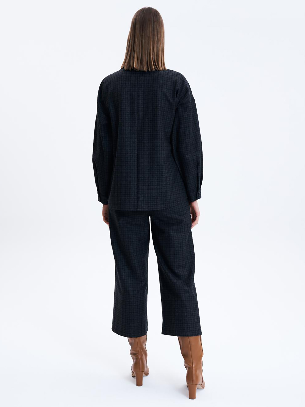 Жакет свободного кроя на пуговицах. Отложной воротник, накладные карманы с клапанами, втачной рукав полной длины.