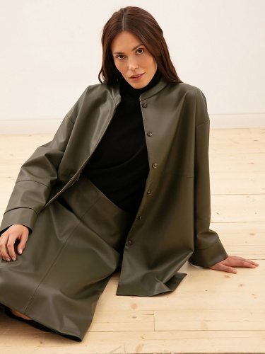 Жакет свободного силуэта из экокожи цвета хаки. Воротник-стойка, супатная застежка на пуговицы. Спущенная линия плеч, длинные рукава с манжетами.