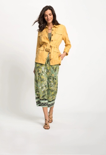 На сайте представлены Российские размеры. Жакет с воротником и планкой на пуговицах по всей длине, а также особая деталь на поясном ремне с большой черепаховой пряжкой делают эту куртку по-настоящему эффектной. Четыре накладных кармана с клапанами дополняют жакет.