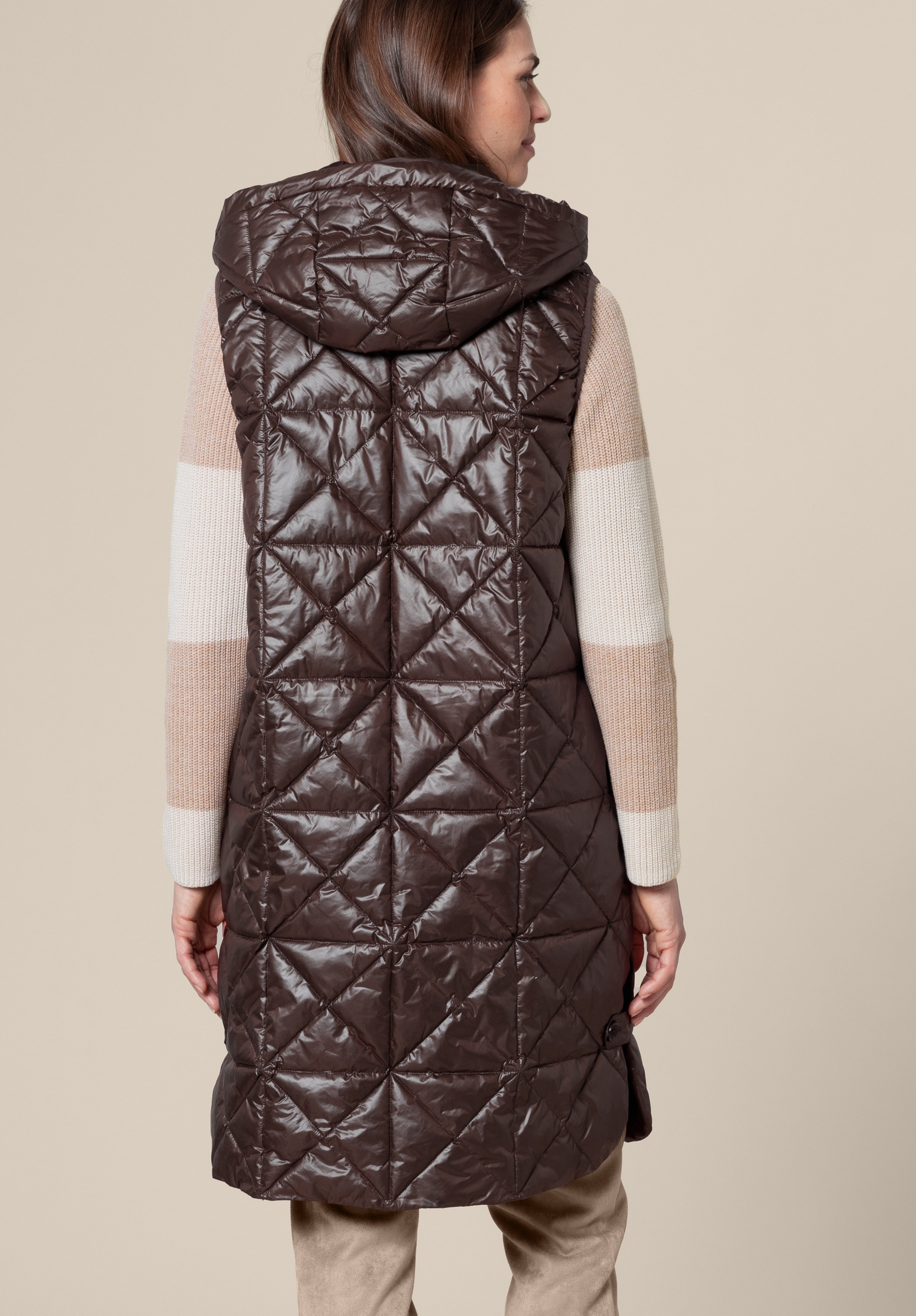 На сайте указаны российские размеры. Длинный стеганый жилет со слегка блестящим эффектом. Полиэстер высокого качества. Боковые карманы, капюшон с кулиской, двусторонняя молния. Прямой крой и посадка, без талии. Длина жилета - 97 см.