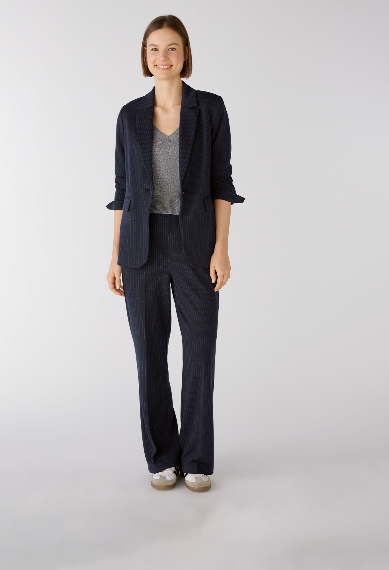 Блейзер из плотного трикотажа. Прямой крой, стандартная длина. Однобортный с воротником с лацканами. Без подкладки. С карманом на клапане и подплечниками. Длина для размера 42 - 69 см.